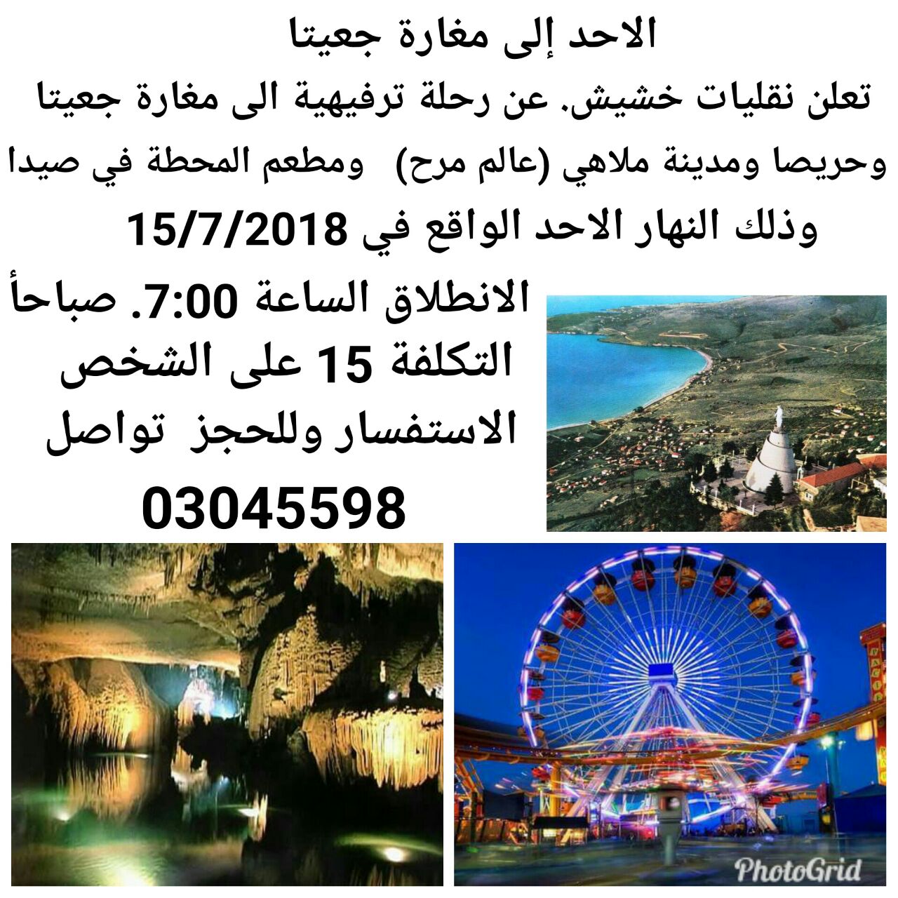 تحت عنوان «مشوارنا أحى بكتير»، أعلنت نقليات خشيش عن تنظيم رحلة ترفيهية إنطلاقاً من الخيام الى مغارة جعيتا وحريصا ومدينة ملاهي عالم مرح ومطعم المحطة في صيدا وذلك نهار الاحد الواقع في 15/7/2018.