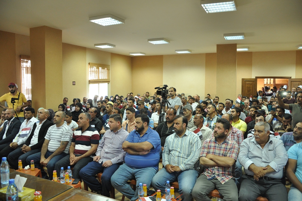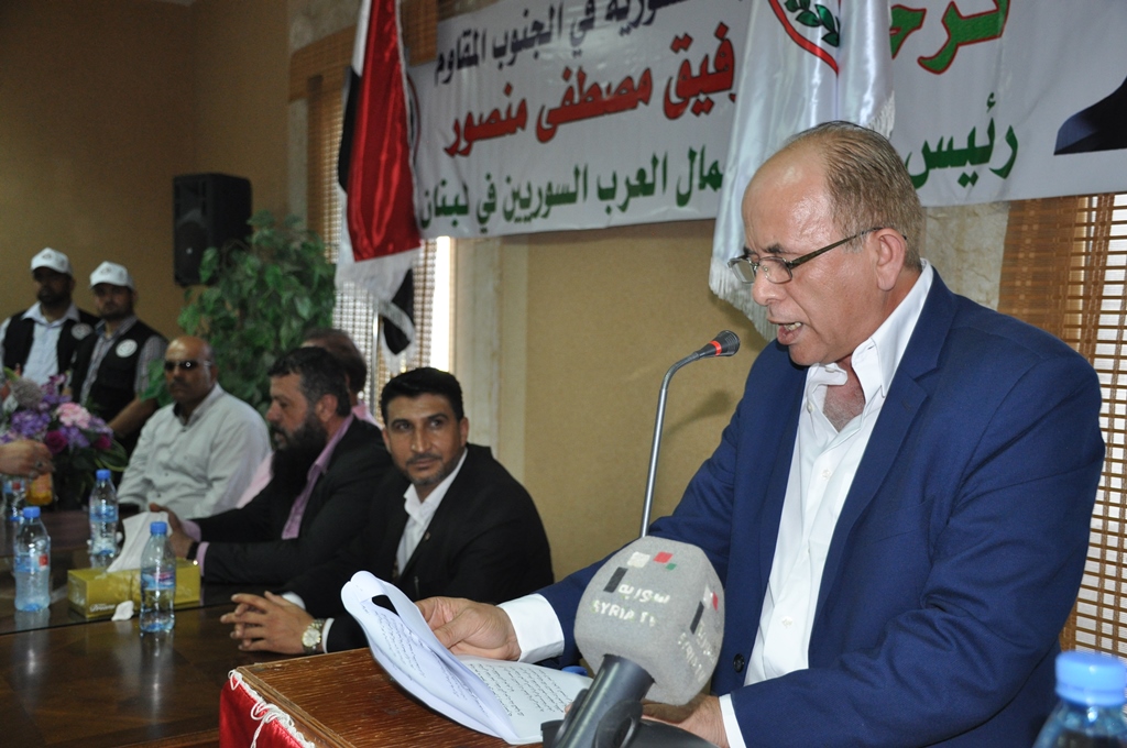 وتلاه منصور بكلمة اشار فيها انه "في خضم الانتصارات العسكرية التي تسطرها سواعد جيشنا العربي السوري في كل مساحة الوطن، ينبغي لسائر قطاعات الشعب استنهاض طاقاتها وسواعدها لمواكبة تلك الانتصارات العسكرية بانتصارات في جبهات الاعمار وتعزيز الصمود في كل بيت وشارع وقرية ومدينة. كل فرد منا له دوره ومكانه في هذه المهمة النبيلة والجليلة. ولا احد يقول انا ليس لي دخل وماذا يمكنني ان افعل؟ ان القلاع الشامخة اساسها مدماك من صخر، وكل مدماك يتكون من صخور مصفوفة مع بعضها. هكذا نريد ان نكون شعبا سوريا يدا بيد حتى نكبر بالوطن ويكبر الوطن بنا. واني، وبما أمثل، انقل اليكم بشكل رسمي وموثوق من اعلى المرجعيات السياسية والامنية دعوة الى فتح ابواب التسويات وازالة كل العوائق والاسباب التي لدى البعض من مخاوف وظنون وتحول دون تفكيرهم بالعودة الى ارض الوطن، وان الوطن في حاجة الينا جميعا ويجب ألا نتردد لحظة في تلبية نداء الواجب تجاهه".