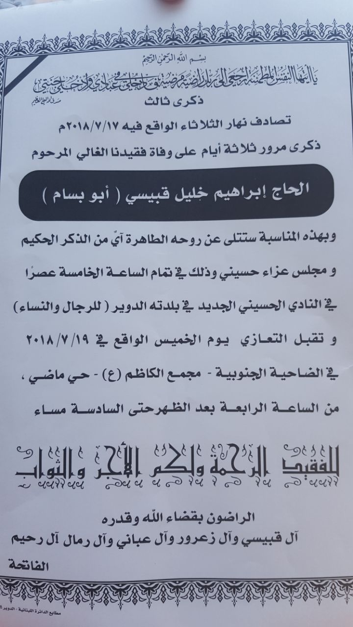 بهذه المناسبة ستتلى عن روحه الطاهرة آي من الذكر الحكيم عند الخامسة عصراً في النادي الحسيني الجديد في بلدته الدوير.