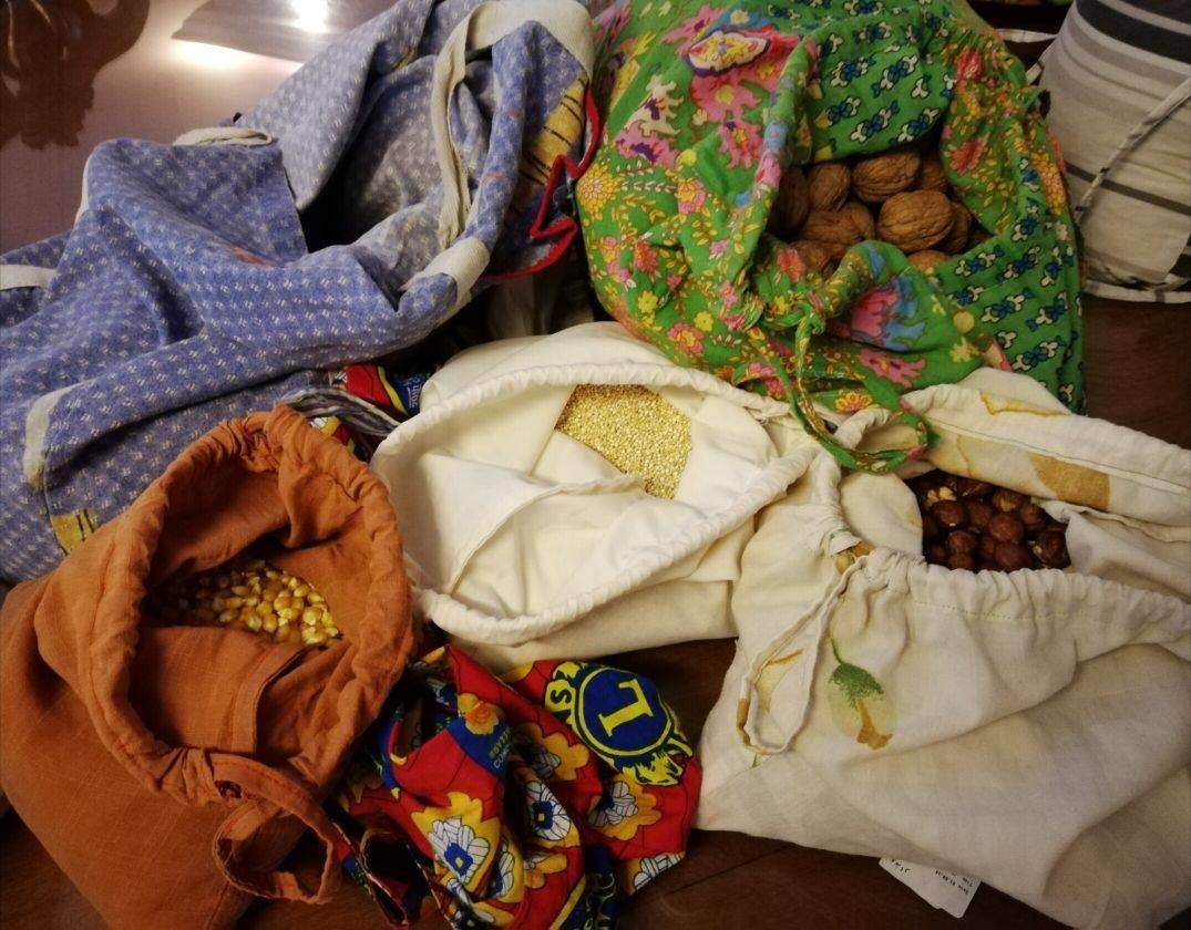 2. شراء المواد الغذائيّة كالحبوب والجوز بإنتاج محلّي في أكياس القماش أم أوانٍ زجاجية نحضرها من البيت.