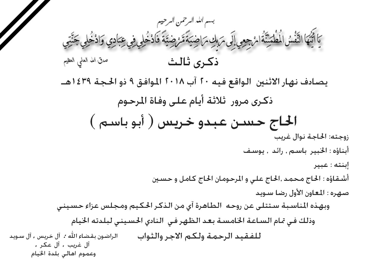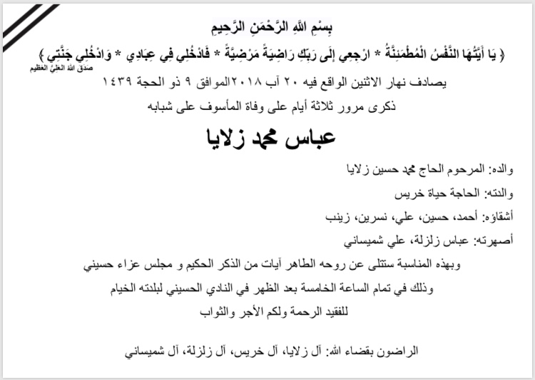 يصادف نهار الإثنين 20 آب الجاري ذكرى مرور ثلاثة أيام على وفاة المأسوف على شبابه المرحوم عبّاس محمد زلايا والمرحوم الحاج أبو باسم حسن عبدو خريس.