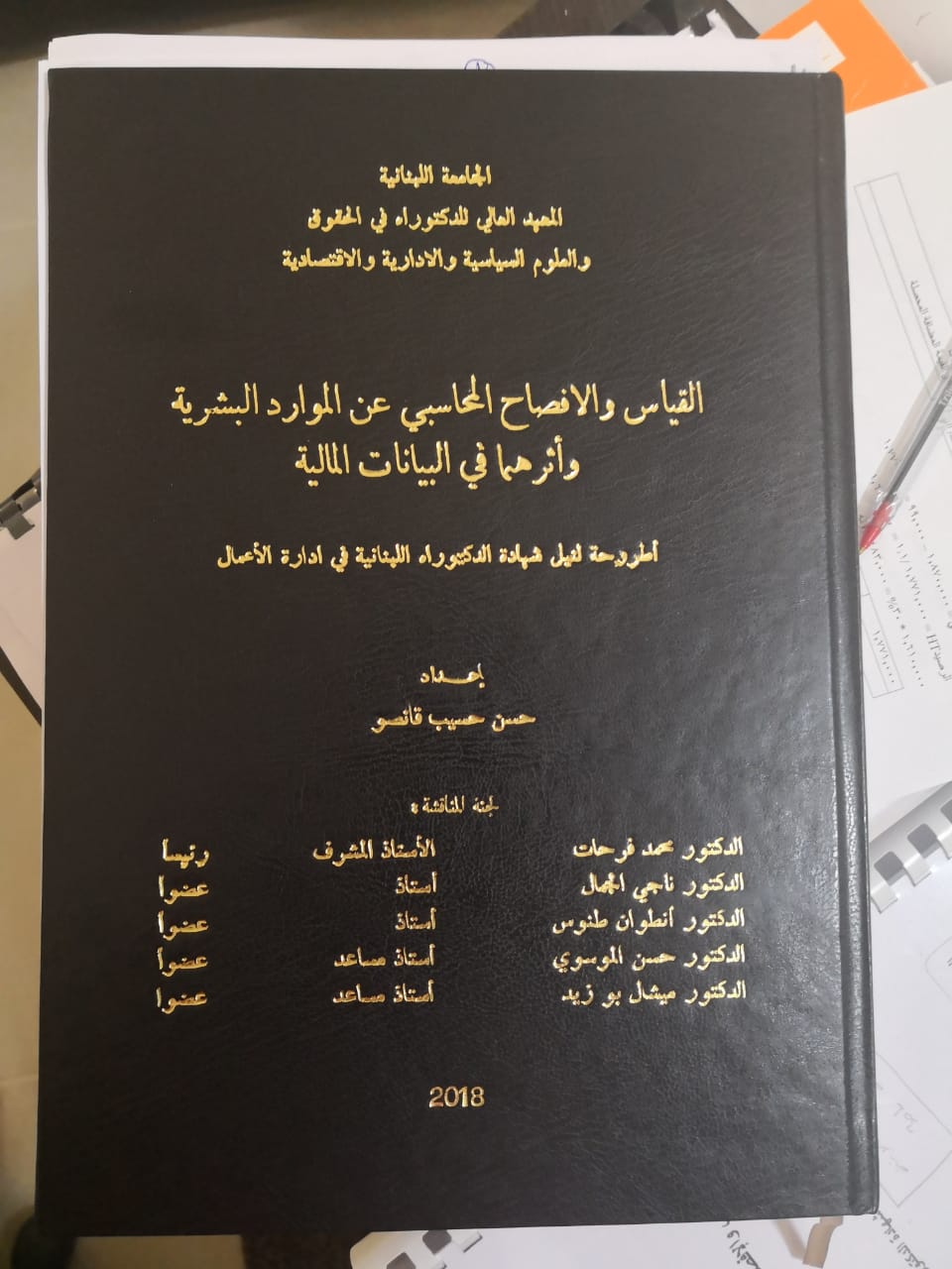حاز الطالب حسن حسيب قانصو على شهادة الدكتوراه في اختصاص ادارة الاعمال من المعهد العالي للدكتوراه في الحقوق والعلوم السياسية والادارية والاقتصادية في الجامعة اللبنانية، عن رسالته بعنوان "القياس والافصاح المحاسبي عن الموارد البشرية وأثرهما في البيانات المالية"، والتي ناقشها امام لجنة تألفت من الدكتور محمد فرحات مشرفا ورئيسا، والدكاترة ناجي الجمال، انطوان طنوس، حسن الموسوي، وميشال بوزيد أعضاء، ونال تقدير جيد جدا