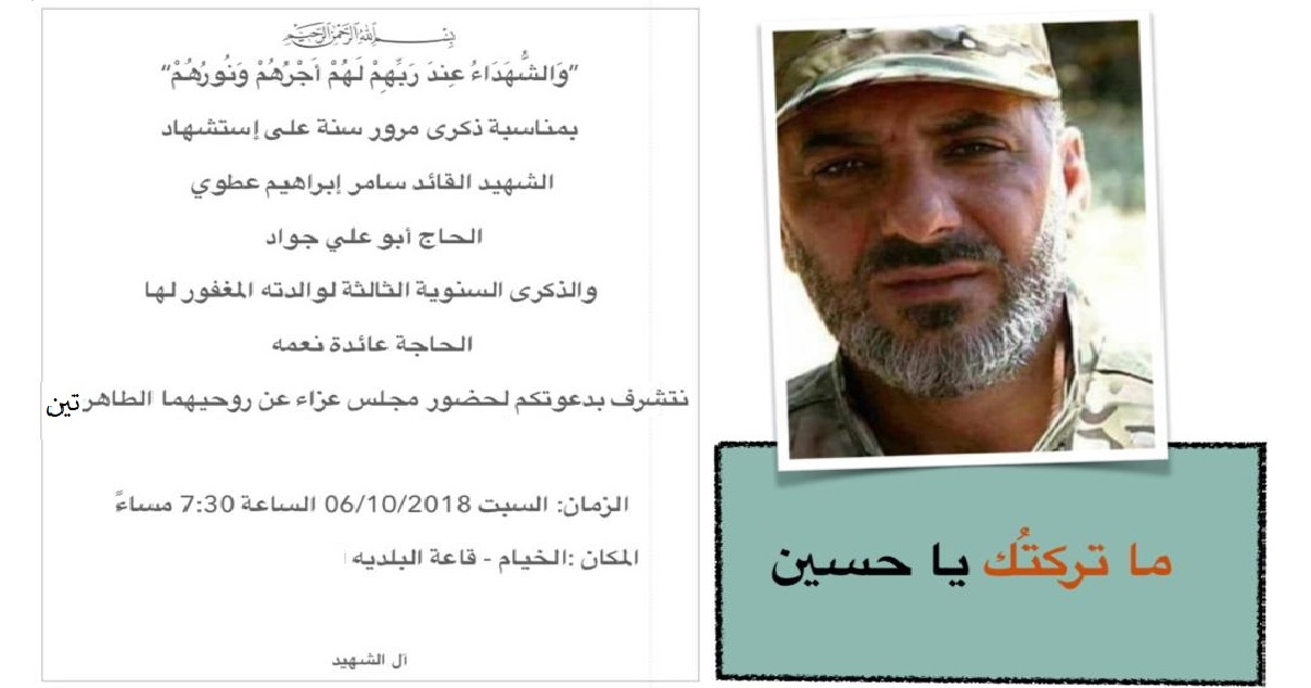 بمناسبة مرور سنة على استشهاد القائد سامر ابراهيم عطوي وفي الذكرى السنوية الثالثة لرحيل والدته المغفور لها الحاجة عائدة نعمه، يقام مجلس عزاء عن روحيهما الطاهرتين السابعة والنصف من مساء السبت 6 ت1 2018 في قاعة بلدية الخيام الكائنة قرب مدرسة الأستاذ علي حسين عبدالله.