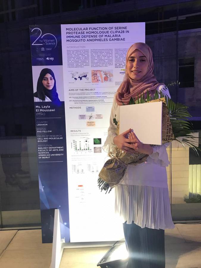تحمل الآنسة ليلى الموسوي شهادة البكالوريوس والماجيستير بتقدير امتياز في علم الأحياء، وهي حاليًا مرشحة لنيل شهادة الدكتوراة في برنامج البيولوجيا الخلوّية والجزيئيّة في الجامعة الأميركية في بيروت. وتشمل مساهماتها العلميّة العديد من المقالات والدراسات في المجلات العلميّة المرموقة والمشاركة في المؤتمرات وحلقات العمل الوطنية والدولية. في تشرين الأوّل ٢٠١٦، وتقديرًا لأدائها الأكاديمي المتميّز ونتاجها البحثي، حصلت الموسوي على منحة لمدّة ثلاث سنوات من المجلس الوطني اللبناني للبحث العلمي. يتمحور اهتمامها البحثي حول دراسة تفاعلات بعوضة الملاريا الأفريقية gambiae Anopheles مع العديد من العوامل المعدية، بما في ذلك طفيليات الملاريا والبكتيريا والفطريات التي تصيب الحشرات، مع التركيز بشكل خاص على الآليات التي يطوّرها جهاز المناعة لدى البعوضة، وكيفية تنظيمها ومساهمتها في القضاء على الميكروبات .ولأنّ البعوض جزء لا يتجزأ من دورة حياة طفيلي الملاريا، فإنّ دراسة التفاعلات المناعية الحاصلة في ما بينهما تزيد القدرة على التحكّم فيها والسيطرة عليها وتعديلها جينيًا إذا استدعت الحاجة، بما يساعد على تصميم استراتيجيات جديدة لمكافحة الملاريا من خلال إضعاف انتقال المرض إلى المضيف البشري عبر إجهاض تطوّر الطفيليّ داخل البعوض.