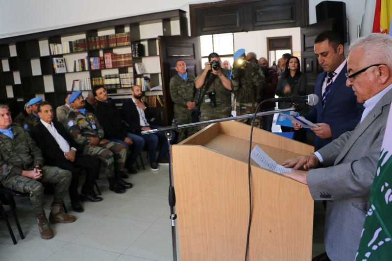 بعدها تم التوقيع على وثيقة تسليم وتسلم المشروع، ثم سلّم صعب درعا تكريمية للجنرال فاليرو، تلاه قطع قالب حلوى بالمناسبة.