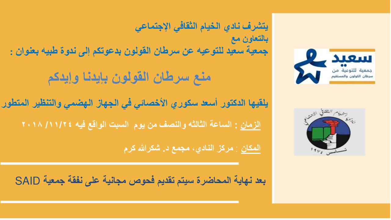 ينظّم نادي الخيام الثقافي الإجتماعي ندوة طبيّة حول الوقاية من سرطان القولون تحت عنوان