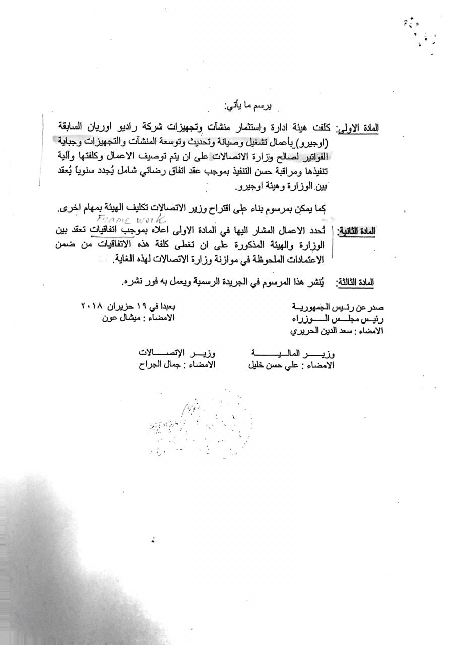 المفارقة أن أوجيرو نفسها كانت تعتبر أن «مشروع العقد» ليس سارياً، وأن الوزير طلب منها في كانون الثاني 2018 الاستمرار بتنفيذ الأعمال وخدمات الصيانة والتشغيل والتوسعة بناءً على العقد السابق الموقع بين الطرفين في مطلع عام 2016 في انتظار انتهاء الإجراءات المتعلقة بالعقد الجديد.