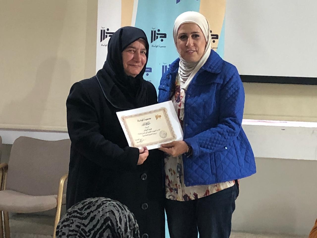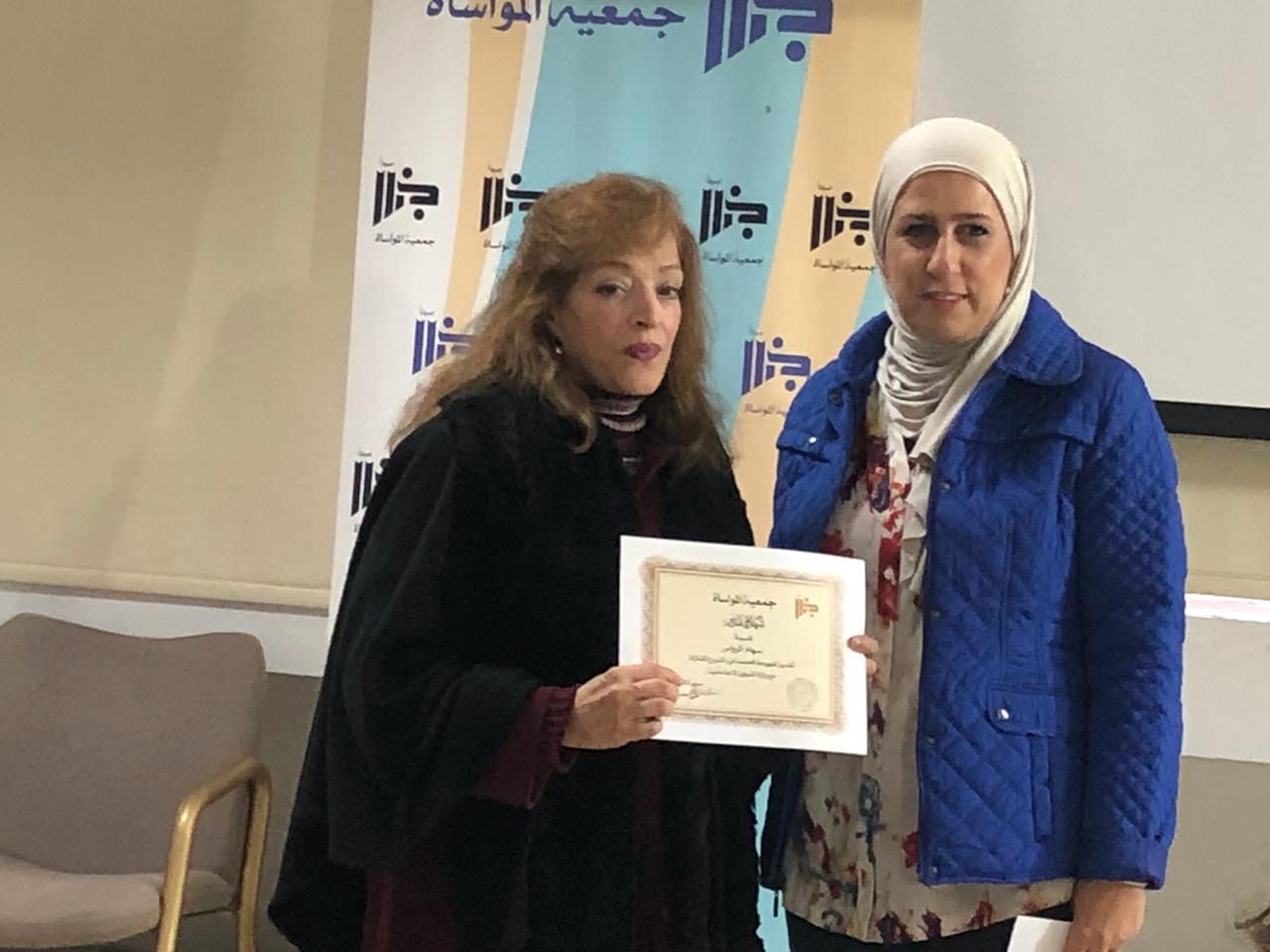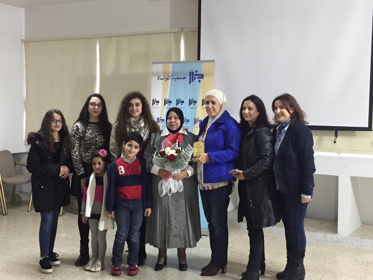 وفي كلمة لها قدّمت مديرة الجمعية الشكر إلى فريق عمل الجمعية في أقسامها كافة مؤكدة على أن الانجازات تتحقق بالتكامل والتناغم بين الأفراد، ثم سلّمت دروعاً تكريمية بمناسبة انتهاء المشروع إلى السيدتين نهى الحلبي ودريّة اليمن عرفاناً لجهودهما التطوعيّة في المشروع المشترك بين الجمعية ووزارة الشؤون الاجتماعية، كما توجهت بالشكر إلى كل من السيدات العاملات على المشروع سهام الرواس وهنية الرواس ووفاء غزلة متمنية لهن دوام النشاط والعطاء.