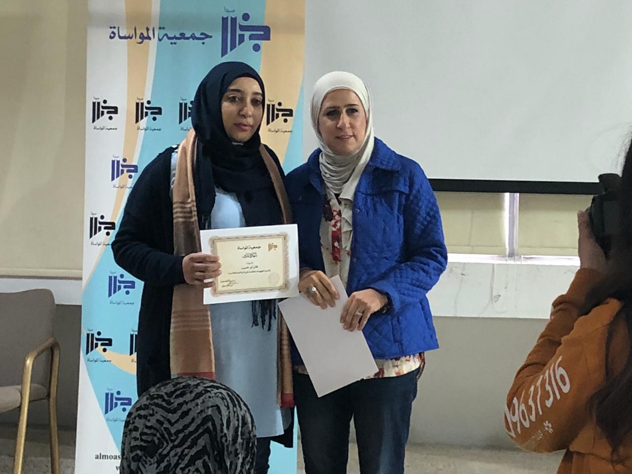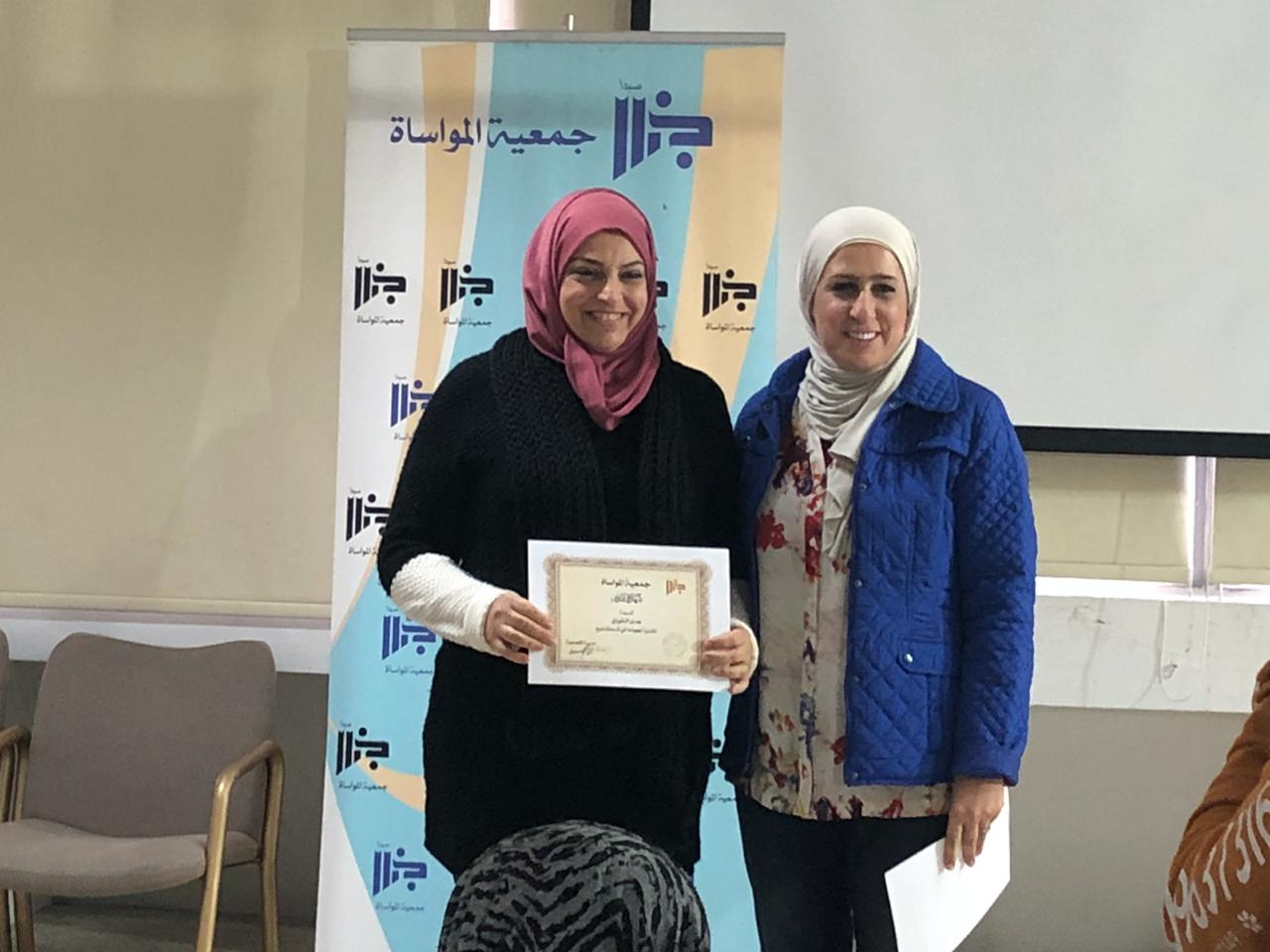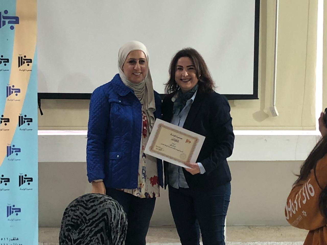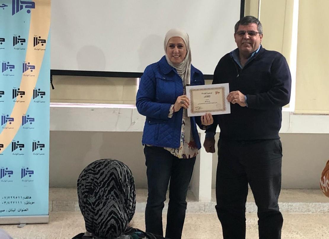 وفي كلمة لها قدّمت مديرة الجمعية الشكر إلى فريق عمل الجمعية في أقسامها كافة مؤكدة على أن الانجازات تتحقق بالتكامل والتناغم بين الأفراد، ثم سلّمت دروعاً تكريمية بمناسبة انتهاء المشروع إلى السيدتين نهى الحلبي ودريّة اليمن عرفاناً لجهودهما التطوعيّة في المشروع المشترك بين الجمعية ووزارة الشؤون الاجتماعية، كما توجهت بالشكر إلى كل من السيدات العاملات على المشروع سهام الرواس وهنية الرواس ووفاء غزلة متمنية لهن دوام النشاط والعطاء.