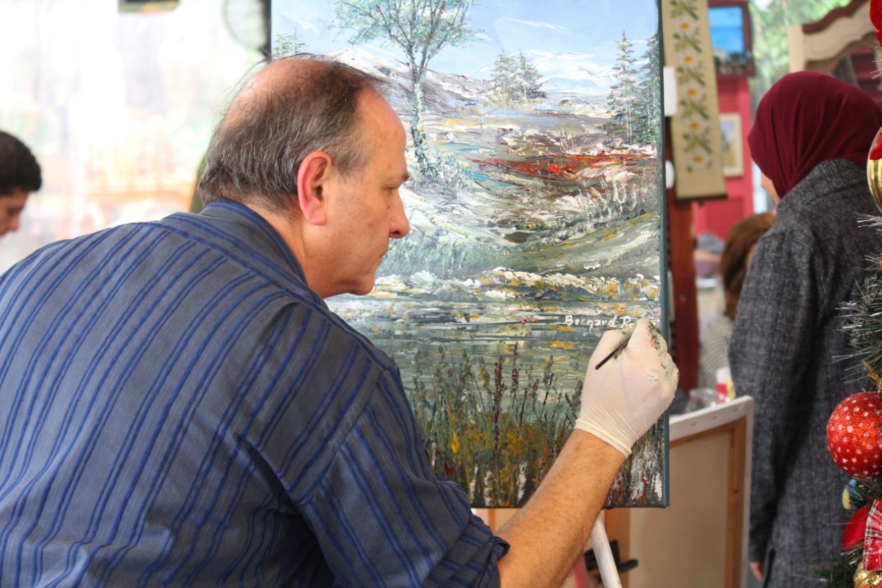 من جهته إعتبر الفنان التشكيلي برنارد رنو والذي رسم لوحة جسد فيها مشهدا من طبيعة لبنان الثلجية والتي استغرقت معه حوالي 25 دقيقة فقط ان الرسم المباشر فيه الكثير من المشاعر والإنفعالات الجميلة واليوم نحن جئنا لكي نحتفي بهذه المناسبة مع الاخوة الفنانين في ملتقى الألوان .
