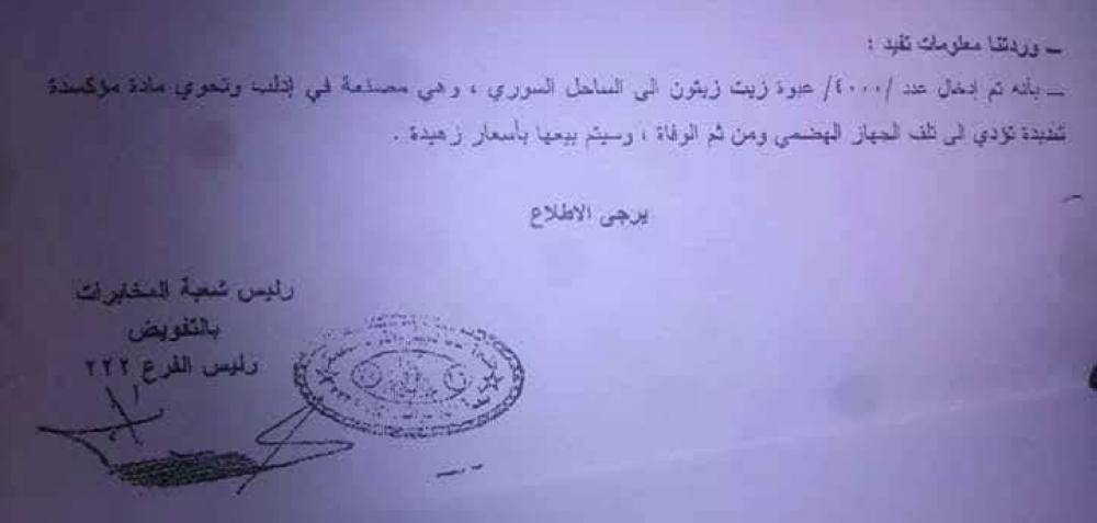 -المعلومات عن زيت زيتون سوري "مسمم"، "قاتل"، "أُعدَّ في إدلب السورية"، بدأ تناقلها قبل نحو 4 اشهر. في 29 ايلول 2018، نشرت جريدة "اللواء" اللبنانية مقالة عن "عمل ارهابي جديد عبر عبوات زيت زيتون سامة وقاتلة"، وضمّنتها "وثيقة أمنية وصلت الى إحدى الأجهزة اللبنانية من السلطات السورية، وفيها ورود معلومات عن إدخال 4 آلاف عبوة زيت زيتون إلى الساحل السوري، وهي مصنعة في إدلب، وتحوي مواد سامة (مؤكسدة) تؤدي إلى تلف الجهاز الهضمي، ومن ثم الوفاة. وكشفت الوثيقة أن هذه العبوات سيتم بيعها بأسعار زهيدة، ما يؤشر إلى وجود رغبة من مصنّعيها لانتشارها في شكل اسرع". ونقلت الصحيفة عن "مصدر امني لبناني" ان "هناك خطورة في وصول هذه العبوات التي تحوي مواد سامة وقاتلة الى الاراضي اللبنانية عبر عدة طرق...".