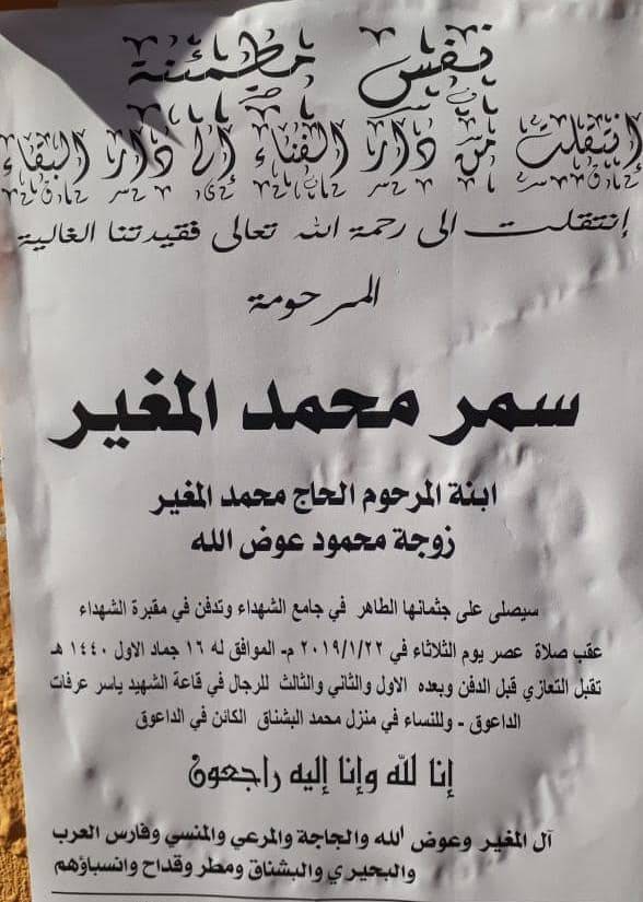 في اليوم التالي، توفيت سمر تاركةً ابنتها الرضيعة وعائلتها في حالة صدمة وحزن. وفق عمها "طلبت حضور قسم التحريات وفتح تحقيق بالحادثة وحضر الطبيب الشرعي ونحن في انتظار النتائج، وعندها لكل حادث حديث".