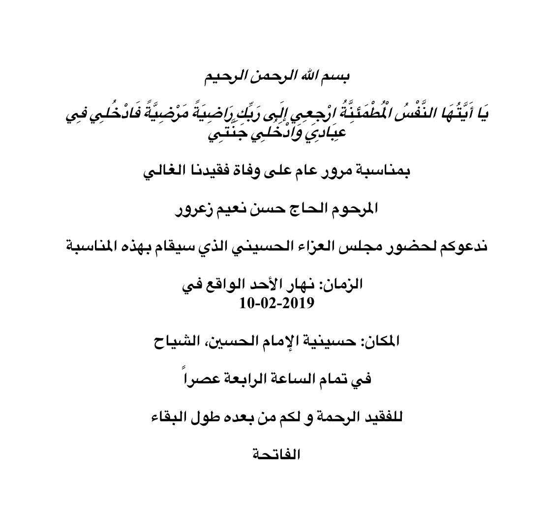 يقام مجلس عزاء حسيني عند الرابعة من عصر نهار الأحد الموافق 10 شباط 2019 في حسينية الإمام الحسين بمحلة الشياح في بيروت