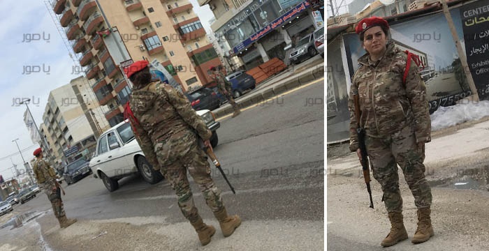 رصدت العدسة مشاركة شابة مدججة بسلاحها وزيها العسكري في حاجز لدورية للشرطة العسكرية في صور كانت تقوم بتفتيش بعض الآليات المارة في الطريق.