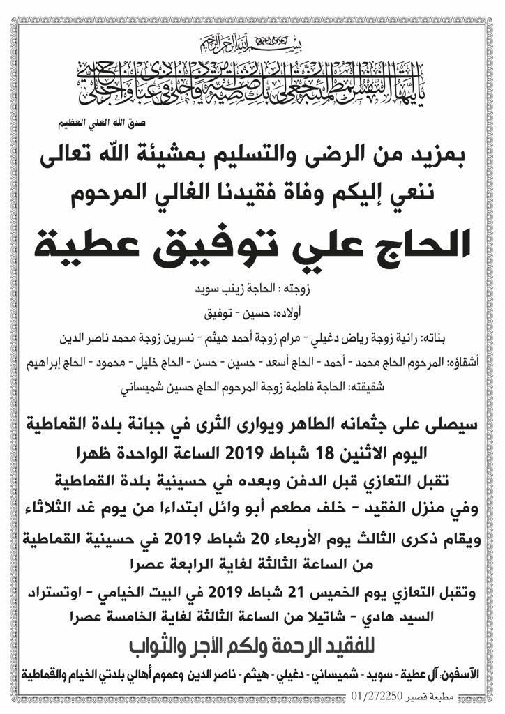 تتقبل عائلة المرحوم الحاج علي توفيق عطيه (أبو حسين) التعازي في بيروت عصر يوم الخميس الموافق 21 شباط الجاري من الثالثة حتى الخامسة عصراً في البيت الخيامي، أوتوستراد السيّد هادي نصرالله.