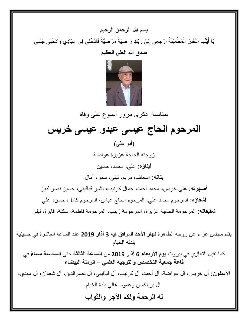 يُصادف نهار غد الأحد الواقع في ٢٠١٩/٣/٣ ذكرى مرور اسبوع على وفاة كوكبة من رجالات الخيام وسيداتها المؤمنين والطيّبين: