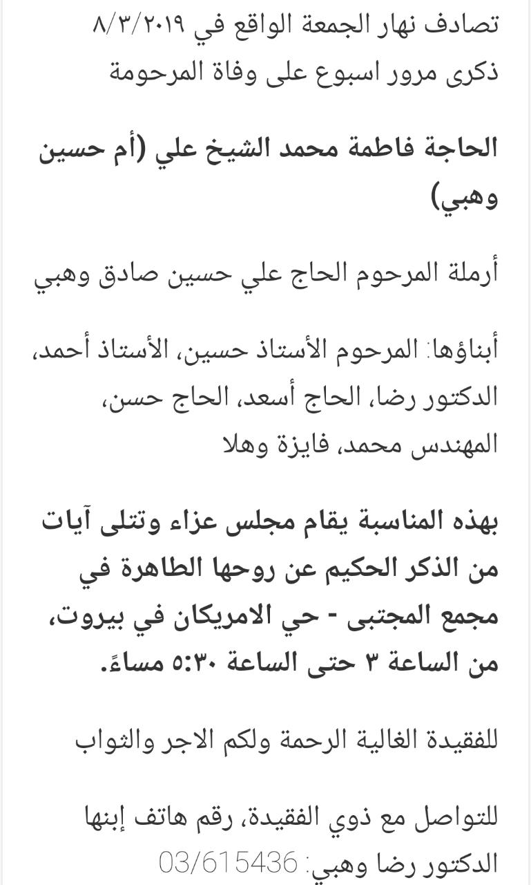 بهذه المناسبة يقام مجلس عزاء وتتلى آيات من الذكر الحكيم عن روحها الطاهرة في مجمع المجتبى - حي الامريكان في بيروت، من الساعة ٣ حتى الساعة ٥:٣٠ مساءً.