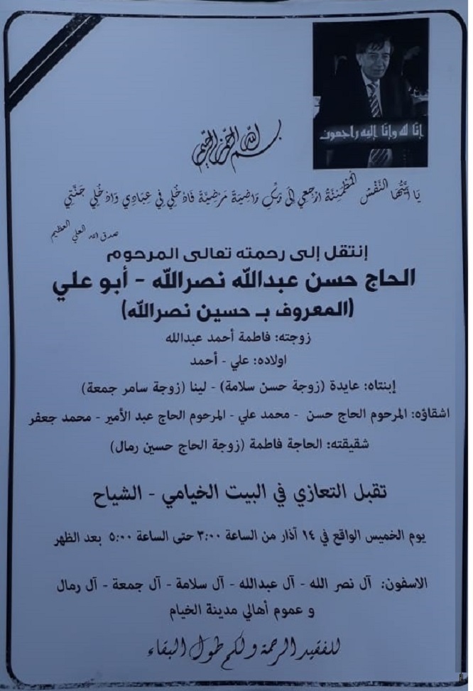 سجل التعازي بالمرحوم الحاج حسن عبدالله نصرالله (أبو علي)