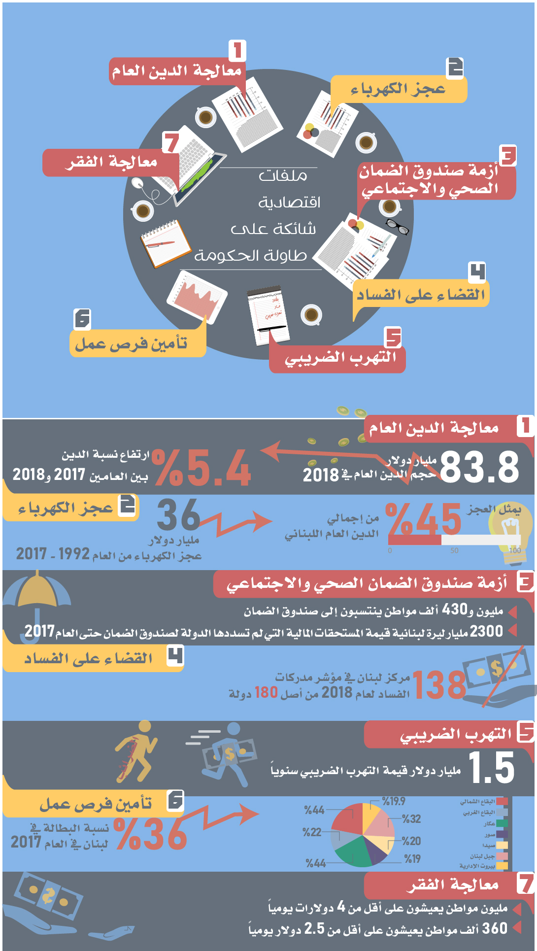 تحديات كثيرة أمام الحكومة اللبنانية. ملفات اقتصادية ومعيشية شائكة ومتراكمة منذ سنوات، تتطلب المعالجة والحلول: الدين العام، الفقر، البطالة، الاستشفاء، الفساد، التعليم، الإصلاحات المالية، إقرار القوانين والمراسيم الخاصة بتنظيم شؤون المواطنين، وغيرها الكثير من الملفات التي باتت أزمات اقتصادية ضاغطة.
