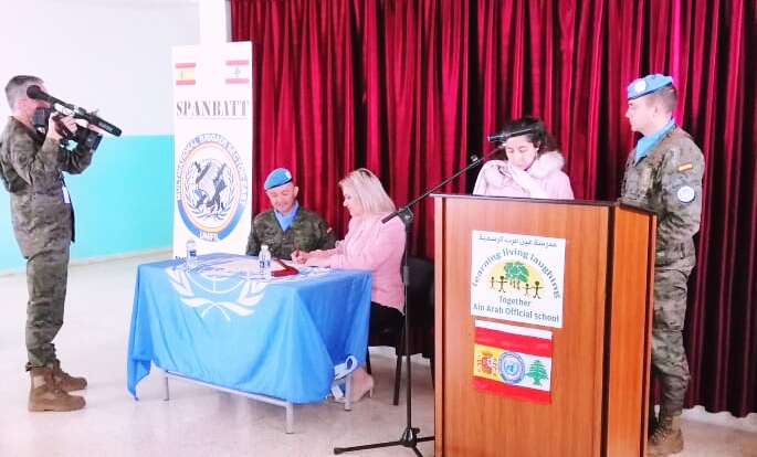 اقيم صباح يوم الاربعاء ٢٧ أذار في مدرسة عين عرب الرسمية احتفال مع قوات اليونيفيل بعنوان ” اليونيفيل تجمعنا ” بمناسبة انهاء مشروع تأهيل صفوف الروضات المقدم من الكتيبة الاسبانية للمدرسة بحضور فعاليات اجتماعية و تربوية .