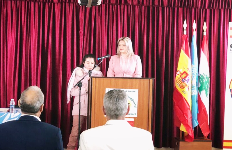 بدأ الاحتفال بالنشيد الوطني اللبناني و الاسباني و نشيد الامم المتحدة لحفظ السلام و بعدها كانت كلمة مديرة المدرسة د.هبة عطوي التي اشادت بدعم الكتيبة الاسبانية بالمدارس الرسمية في المنطقة و شكرت قائد الكتيبة الاسبانية على المشروع المقدم. كما كانت كلمة لممثل رئيس المنطقة التربوية في محافظة النبطية الاستاذ نهاد دياب شكر بدوره الكتيبة على كل المساعدات التي تم تقديمها للمدارس الرسمية .