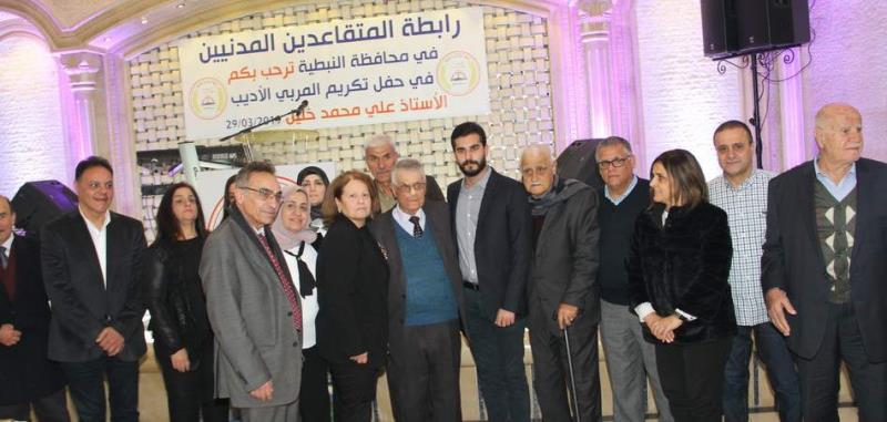 كرمت رابطة المتقاعدين المدنيين في محافظة النبطية، في احتفال حاشد في مطعم قصر الملوك، المربي المتقاعد علي محمد خليل، حضره ممثل وزير المالية علي حسن خليل نجله المحامي حسن علي خليل، ممثل النائب ياسين جابر المحامي جهاد جابر، ممثل النائب هاني قبيسي الدكتور محمد قانصو، مدير الجوازات والجنسية في الامن العام العميد الركن حسن علي أحمد، رئيس رابطة المتقاعين المدنيين في النبطية علي توبة وشخصيات وفاعليات وعائلة المكرم وأعضاء الرابطة وأصدقائها.