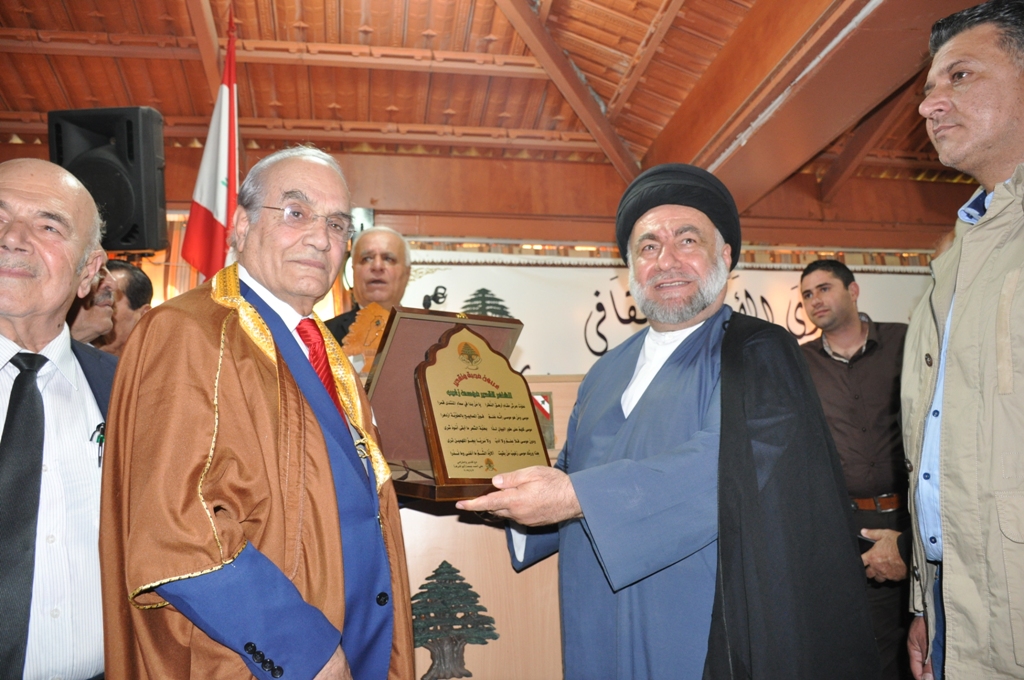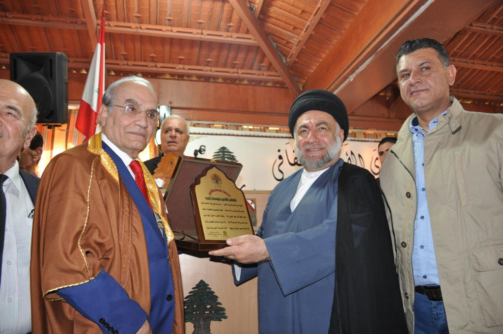 ثم قدم المفتي مكي درع المنتدى للمحتفى به، وألبسته اماني علي جمعة عباءة المنتدى ، واهداه مهدي علي جمعة سيفا مذهبا.
