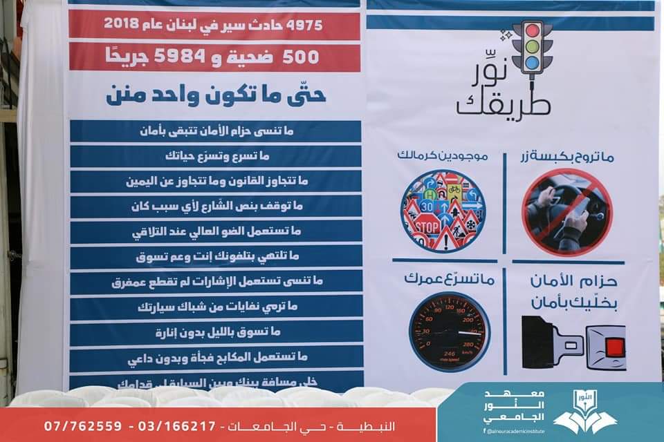 في سياق الخطة الأمنية التي تقوم بها وحدات قوى الأمن الداخلي للحد من حوادث السير على الطرقات الرئيسية- وبعد الحملة التوعوية التي أقامها نشطاء مواقع التواصل الاجتماعي لتنبيه السائقين من مخاطر القيادة على أوتستراد الزهراني مطالبين الدولة بإضاءة الطريق وبالسعي لإيجاد حل جذري بسبب ارتفاع عدد الحوادث اليومية على طريق الزهراني - النبطية المسمّى "اوتستراد الموت"- انطلقت خطة أمنية مشتركة بمبادرة من قيادة سرية النبطية في قوى الأمن الداخلي وبالتعاون مع بلديات المنطقة، حيث أقام عناصر رجال قوى الأمن حواجز مرور ثابتة مجهزة بكاميرات مراقبة في عدة نقاط، وانتشروا مع عناصر شرطة البلديات على الطريق الممتدة من جسر الزهراني وحتى مستديرة كفرمان، وذلك لمراقبة حركة المرور ولتأمين السير، ومن أجل تعزيز المفارق الحيوية باليافطات والمنشورات الإعلانية التحذيرية والتوجيهية، كما جرى توزيع الحلوى على المارة والسائقين. وأيضا كانت مشاركة لافتة لمعهد النور الجامعي في النبطية الذي ساهم بتوزيع منشورات إرشادية وبتقديم قسائم محروقات مجانية للسائقين الملتزمين بقواعد وقوانين السير.