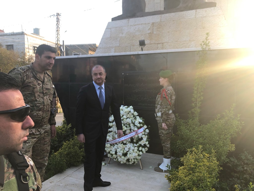 وقام بوضع اكليل من الزهر عند النصب التذكاري لشهداء الجيش اللبناني في البلدة، وقدمت الفرقة الموسيقية في الجيش اللبناني النشيد الوطني اللبناني وموسيقى الموتى والشهداء.