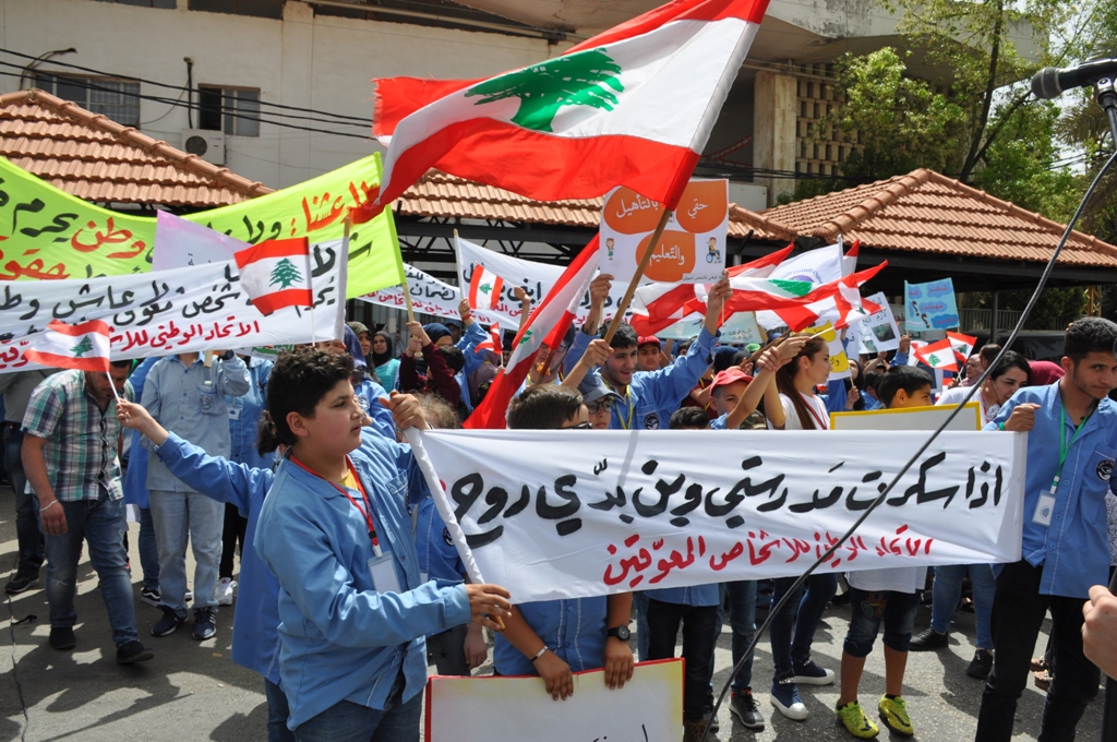 وأنشد الطلاب المعتصمين النشيد الوطني اللبناني وسط اغان وطنية ، رافعين يافطات وشعارات ومنها " حقي بالتعليم بيد اصحاب القرار ، " اين الدولة من المسؤولية الاجتماعية "،" لا يوجد شخص معوق انما هنالك مجتمع معيق ودولة معيقة "،" اذا سكرت مدرستي وين بدي روح ".