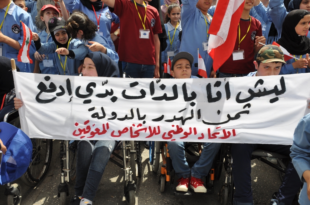 نظم الاتحاد الوطني لشؤون الاعاقة وجمعيتي " تمكين للعيش باستقلالية "، وجمعية المنى التخصصية " عيون " البراءة اعتصاما مع طلاب وطالبات المدارس التي تتبع للجمعيتين امام السراي الحكومي في النبطية استنكارا على تقليص ميزانية وزارة الشؤون الاجتماعية في الموازنة .