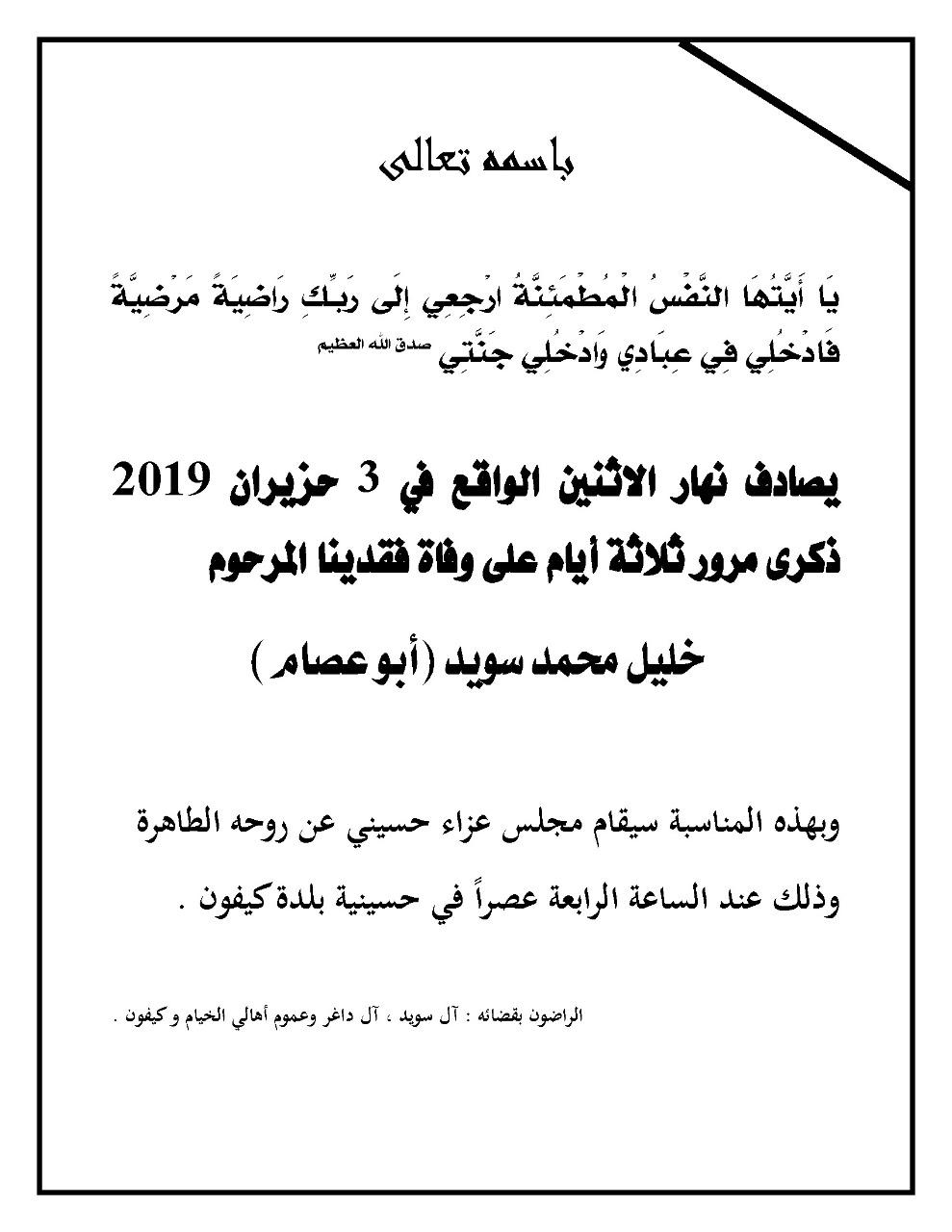 يقام مجلس عزاء عن روحه الطاهرة يوم غد الإثنين 3 حزيران 2019 عند الساعة الرابعة عصراً في حسينية بلدة كيفون