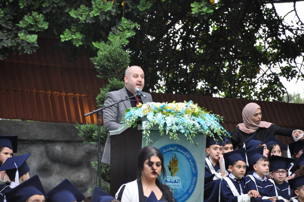 وقال: تحت أجمل سما مجتمعين اليوم، وبحضن أوسع بيت مغمورين، بيت المحبة والحب والأمان، بيت التسامح والإلفة والحنان، بيتنا وبيتكن، بيت هالوروود الحلوة اللي زّهرت بعد 3 سنين، بيت العيلة الوحدة، عيلة المدرسة الإنجيلية. هالبيت اللي تحت سقفو كلنا منحتمي، هالبيت اللي كل زاوية منو بتحكيلنا حكاية، حكاية دفا، وحكاية وفا، حكاية طفولة بالبراءة مكللة، حكاية قَلم وكتاب، حكاية عَلم مزروع من أجيال. المدرسة الإنجيلية الوطنيّة بالنبطيّة هيي كل الحكاية، من القلب إلها ألف تحية.