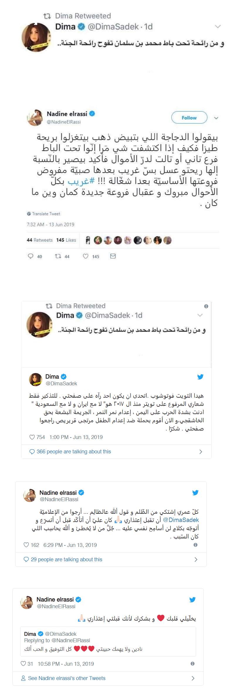 بعد خلافها التويتيريّ مع النائبة بولا يعقوبيان، شنّت الممثلّة نادين الراسي هجوماً أول أمس الخميس على الاعلامية ديما صادق على خلفية تغريدة انتشرت للأخيرة جاء فيها: "ومن رائحة تحت باط محمد بن سلمان تفوح رائحة الجنة..".