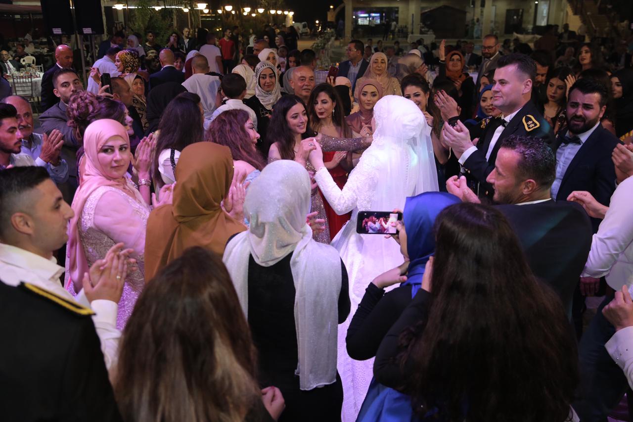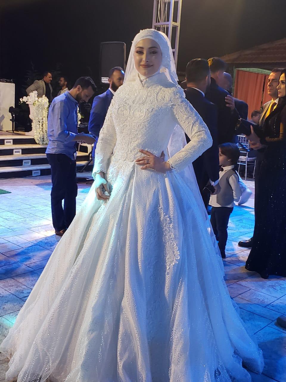 تألّقت العروس نور بفستانها الأبيض المرصّع، وإطلالتها البهية، وابتسامتها البشوشة، لتشارك عريسها علي والأهل والأصدقاء الفرحة بالزفة والرقص.