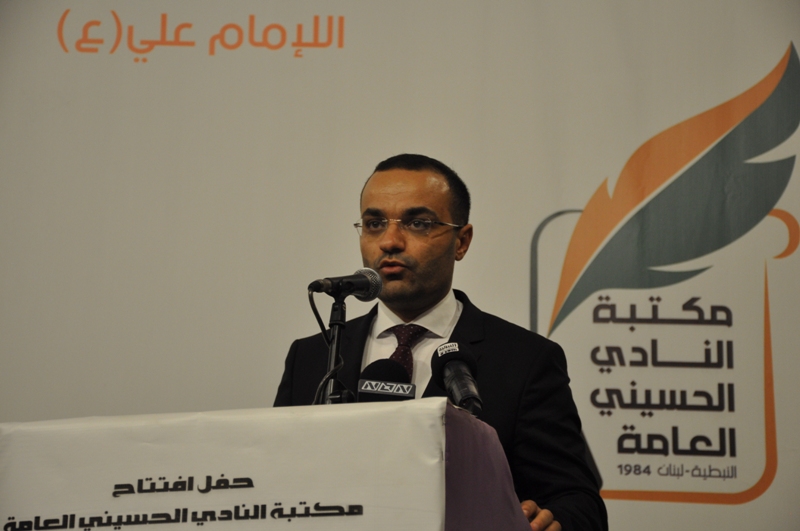 وقال: "ببالغ الفخر، يسرنا أن نقدم مكتبة النبطية إلى لبنان. هذا المشروع الذي يعكس رؤية المدينة المستقبلية، ونتيجة الجهود المشتركة للحفاظ على تراثنا وثقافتنا. نحن فخورون للغاية بأن نتمكن من تقديم رؤية أكثر تعمق إلى العالم العربي من خلال مجموعة من النشاطات التي تجرى على مدار العام وتكون في محورها اهتماماتنا كافة من معيشية واجتماعية وسياسية وثقافية. إن هذه المدينة التي لم تستلم للعدو برجالها ونسائها وشيوخها وأطفالها، قاومت بأقصى ما تملك، فحصلت الاعتقالات والمجازر على مدى عقود من الزمن، وفي كل مرة كانت تنتفض لتعود في أبهى حلة، بإحياء المناسبات الدينية التي تبث العزيمة في نفوس أبنائها وأبناء القرى المجاورة. هذه المدينة التي ارتبط اسمها بالإمام الحسين عليه السلام، تخرج الأبطال إلى الوطن، بولاء صادق ووطنية مشهودة".