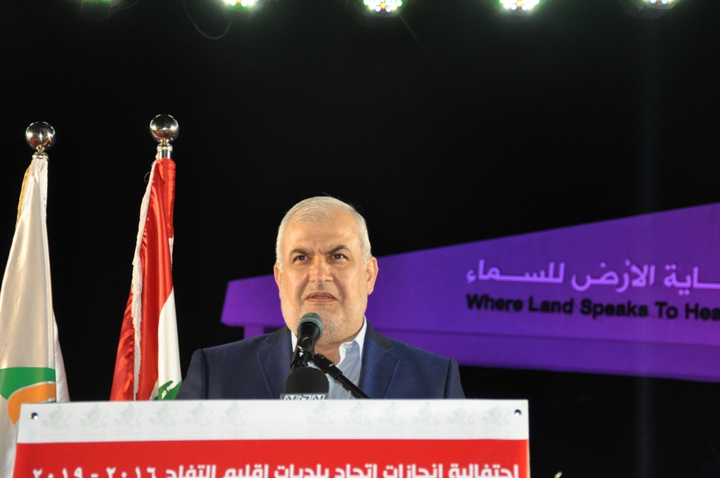 اضاف: "نقف بينكم اليوم، لنقدم إليكم أنا واخوتي في اتحاد بلديات إقليم التفاح بكل خجل، بعضا مما يستحقه أهلنا الأعزاء على قلوبنا، بعض وفاء، لقد اهتم الاتحاد في النصف الأول من ولايته بالمدارس الرسمية، بناء وترميما وتجهيزا ونشاطات، إيمانا منا بأن النهوض الحقيقي بمجتمعنا لا يكون إلا على أسس علمية سليمة، وكلما انتشر نور العلم، انحسرت ظلمات التكفير وحروب الجاهلية، لنبني ونحمي بسواعد أبنائنا وعقولهم وقدراتهم التي لا حدود لها، وها نحن نراهم وهم في ريعان الشباب شهداء وأبرار لا يبخلون لا بدم ولا بعلم في مسيرة المقاومة والتنمية، من أجل لبنان كل لبنان، وتحولت مراكز التدريب المستمر التي أنشأناها إلى خلية نحل لا تهدأ لإكساب الأجيال مهارات متقدمة سواء في التقنيات الحديثة أو إدارة المشاريع أو الرياضة والسياحة والزراعة، ولم ننس كبار السن لنرد لهم بعض جميلهم علينا من مبادرات الرعاية والعناية".