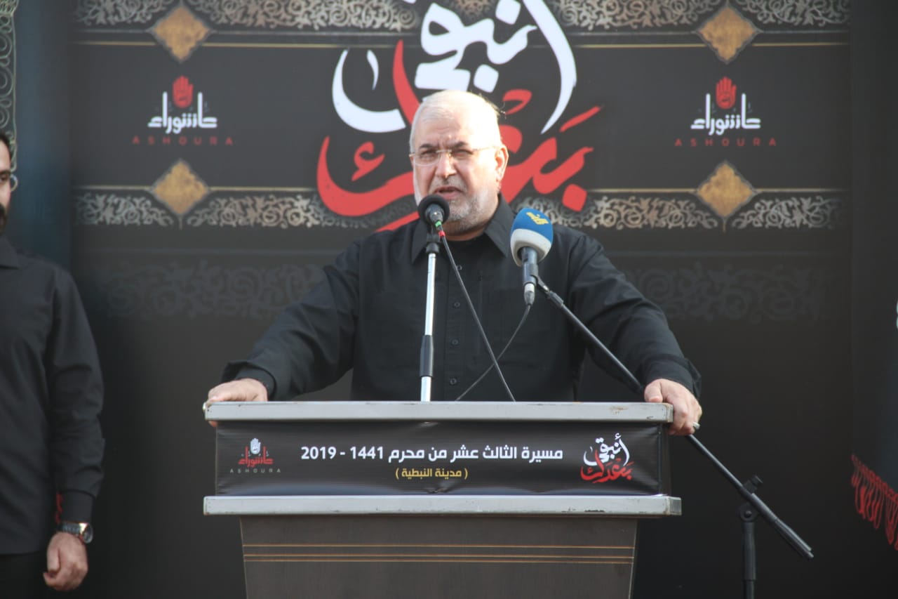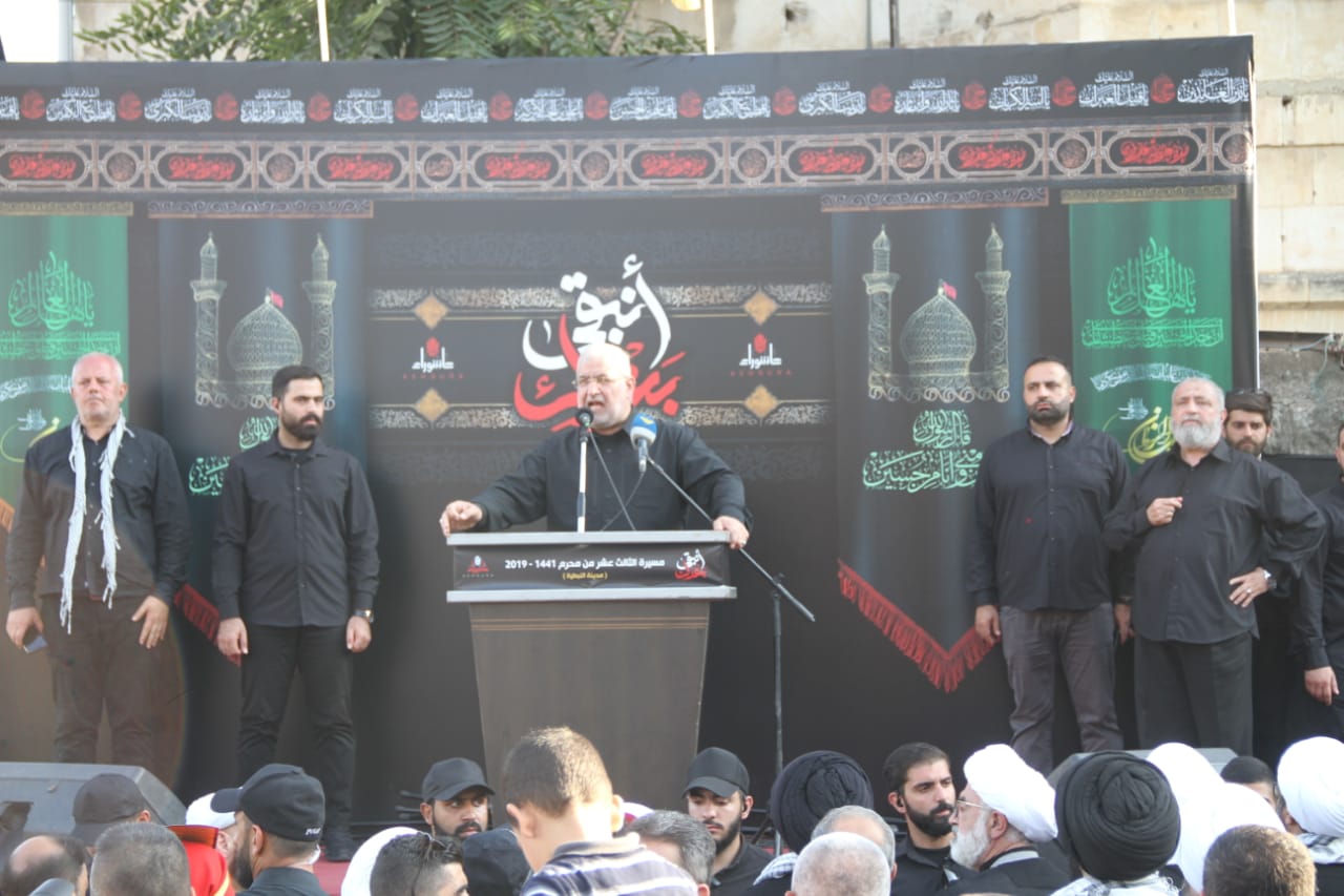 وقال: قضية الحسين اليوم هي قضية وقف العدوان والتحالف العدواني على اليمن ، قضية الحسين اليوم هي قضية الحفاظ على سيادتنا في هذا البلد لبنان ، قضية الحسين اليوم هي فك الطوق ورفع اليد الاميركية عن العراق وشعبه وقضية الحسين اليوم هي اعادة سوريا موحدة قوية معبرة عن قناعاتها بمحور المقاومة، قضية الحسين اليوم هي استعادة كل الحق السليب لفلسطين ولشعبها ولقضيتها وتقرير حق الشعب الفلسطيني بارادته ، كل ساحة يخوض فيها الحق معركة ضد الباطل هي ساحة كربلاء ، وكل يوم ينتصر فيه رجال ونساء واطفال وشيوخ لقضايا الحق والعدل والخير والحرية والامن والاستقرار للشعوب هي قضية عاشوراء ، كل يوم كربلاء كل ارض عاشوراء