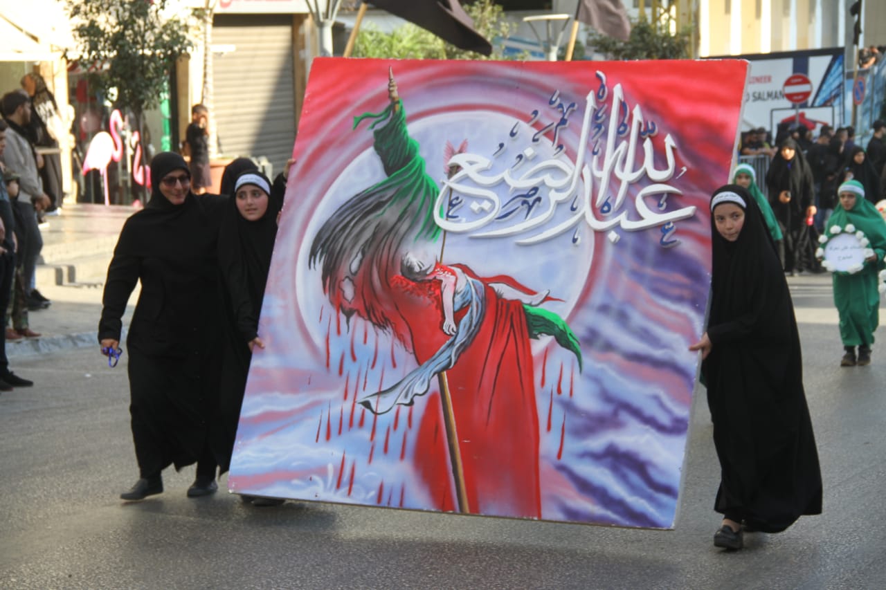 كما سارت خلفهم مواكب حاشدة من الهيئات النسائية وعوائل الشهداء اللواتي حملن صور لابنائهن الشهداء اضافة الى الرايات السوداء والخضراء..