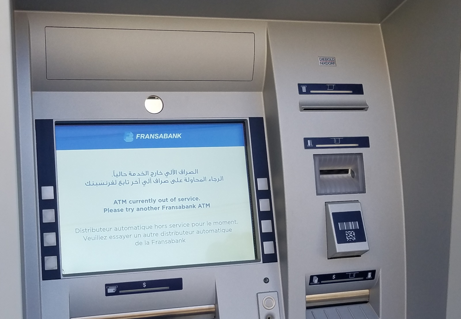 وفي فرنسبنك، ما أن فرغ صراف آلي من محتوياته حتى سارعت مديرة الفرع إلى طمأنة المواطنين حول إمكانية استعمال الصراف الآخر المتوفر، على أمل إعادة ذلك الصراف خلال وقت قصير إلى العمل بعد إعادة تعبئته.