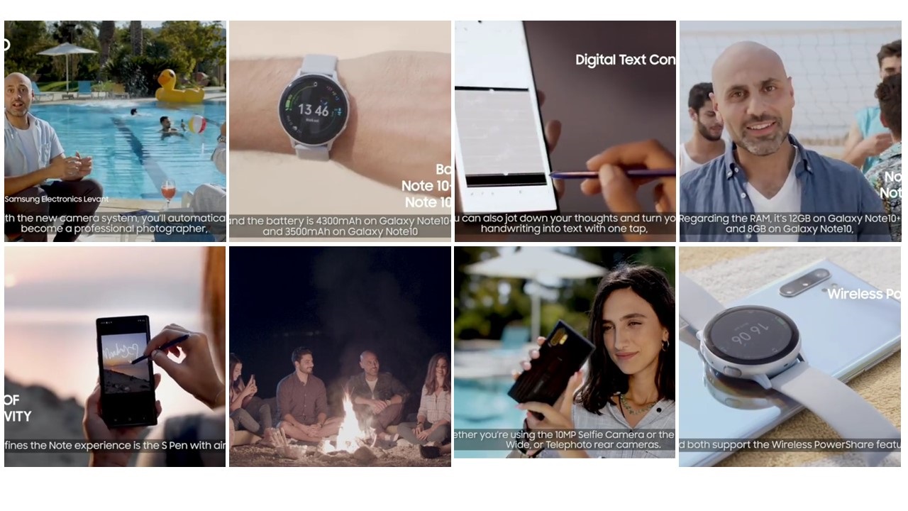 وقدّمت الفيديوهات لمحة عامة عن مجالات استخدام الأدوات الحديثة لالتقاط صور وتسجيل مقاطع فيديو مذهلة ومشاركتها عبر قنوات التواصل الاجتماعي عبر هاتف Galaxy Note 10. وبفضل تقنيات وبرامج التصوير المتقدمة التي ينفرد بها الهاتف، يمكن للمستخدمين أن يحظوا بقدرات تضاهي التصوير الاحترافي بكل بساطة، فعلى سبيل المثال تعمل تقنية التركيز المباشر على إجراء تعديلات في عمق المجال لكي تتمكن من طمس الخلفية والتركيز على الجسم المراد تصويره، بينما تعمل تقنية Zoom-In Mic على تضخيم الصوت في الإطار والتخلص من المؤثرات السلبية للمساعدة في التركيز فقط على الأصوات التي تريدها. أمّا ميزة Super Steady الجديدة والمحسنة فتعمل على تثبيت اللقطات لإزالة الاهتزازات التي عادة ما تؤدي إلى ضبابية المشهد، وهي متاحة الآن في وضعية التصوير Hyperlapse لمقاطع الفيديو الثابتة ذات الفاصل الزمني.