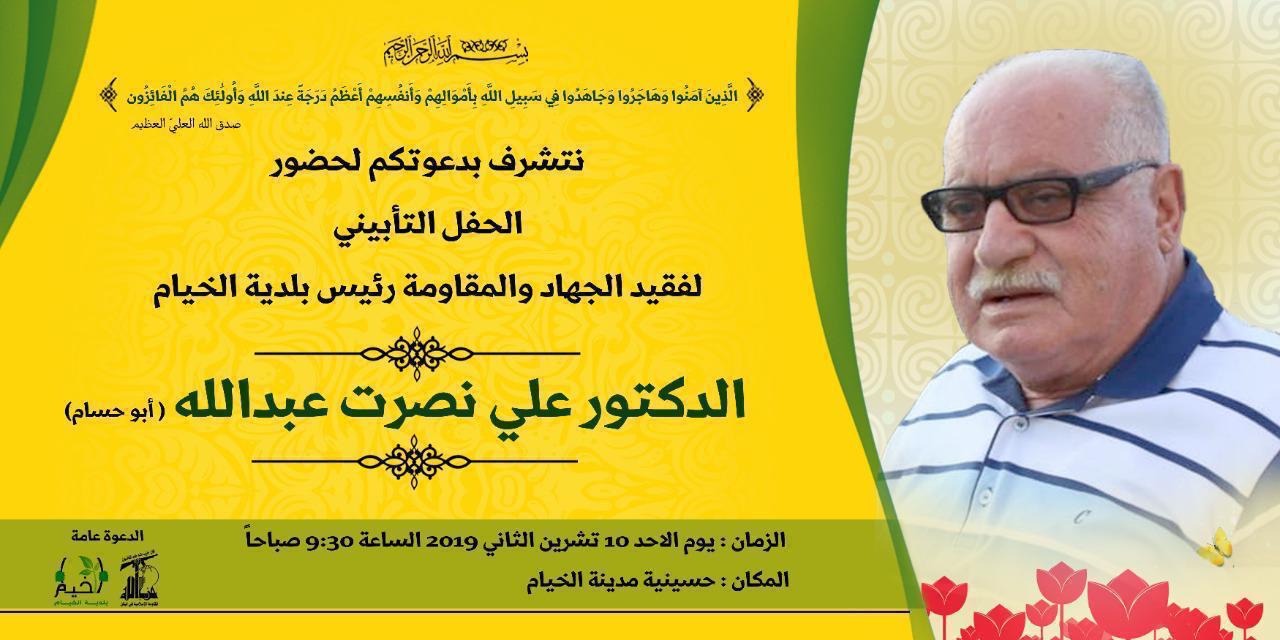 حيث سُيقام حفل تأبين مهيب يليق بصاحب المناسبة، وذلك في الساعة التاسعة والنصف من صباح يوم غدٍ الأحد في حسينية مدينة الخيام.