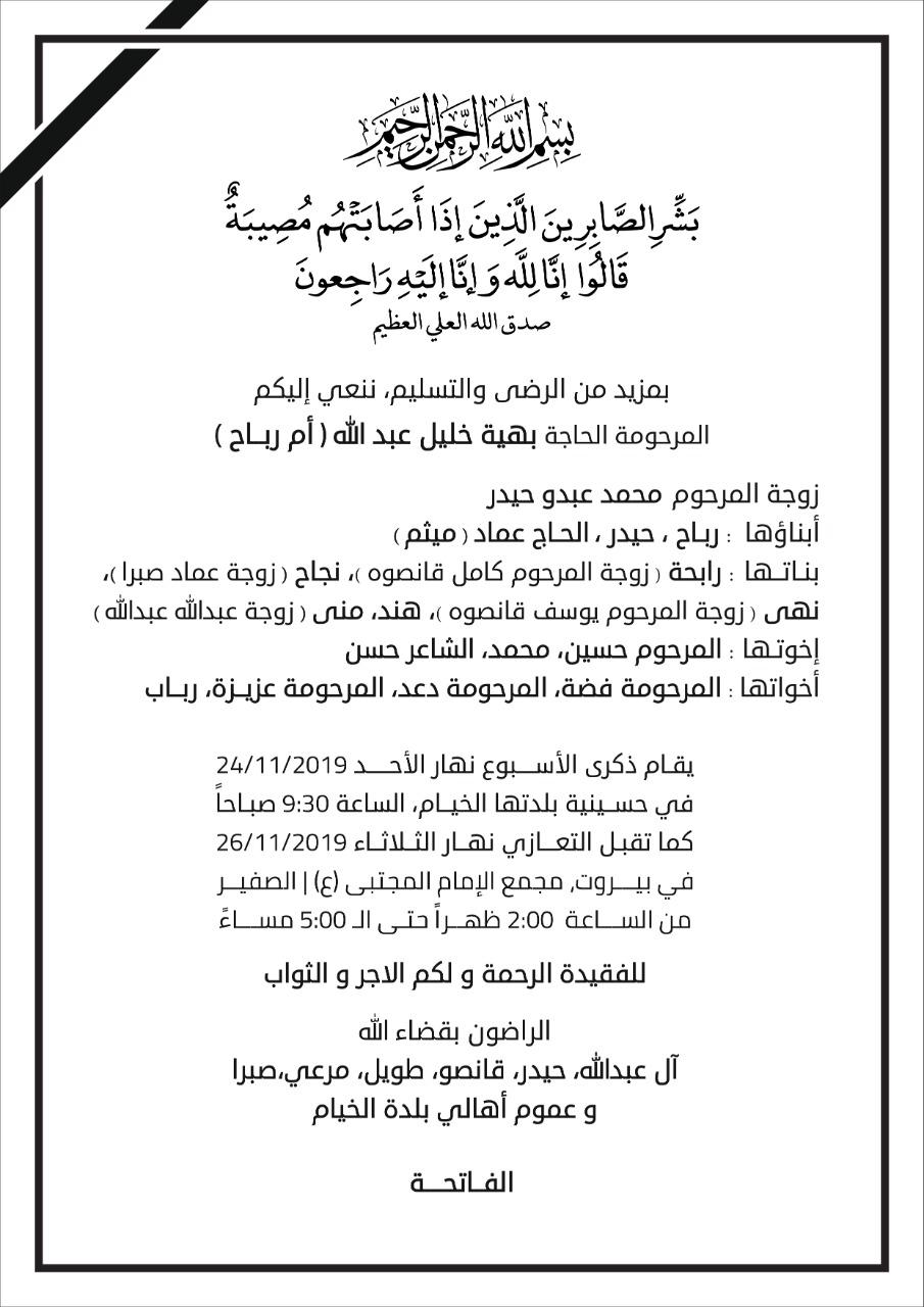 وتتقبل عائلة المرحومة التعازي في بيروت يوم الثلاثاء الموافق 26 ت2 2019 في مجمع الإمام المجتبى عليه السلام، الكائن في الصفير / حي الأمريكان، من الساعة الثانية بعد الظهر حتى الساعة الخامسة عصراً.