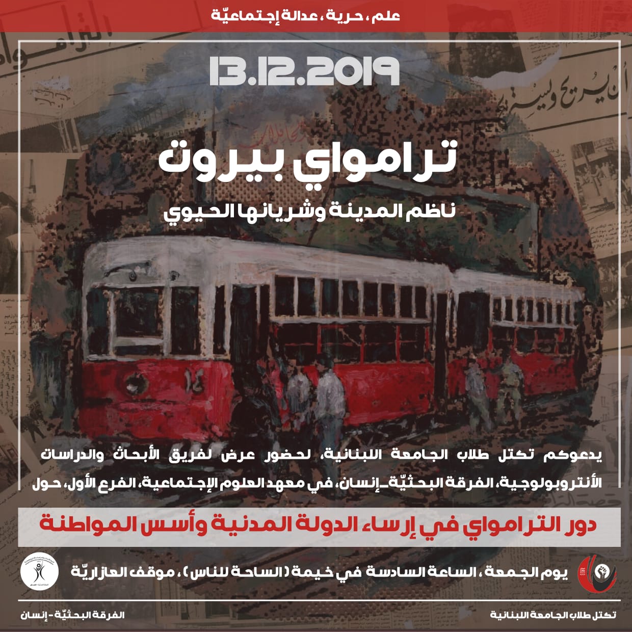 تحت شعار «علم، حرية، عداة اجتماعية»، دعا تكتل طلاب الجامعة اللبنانية لحضور عرض لفريق الأبحاث والدراسات الأنتروبولوجية، الفرقة البحثية - انسان، في معهد العلوم الاجتمعية، الفرع الأول، حول