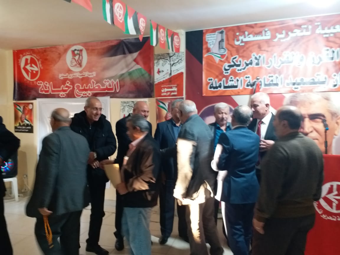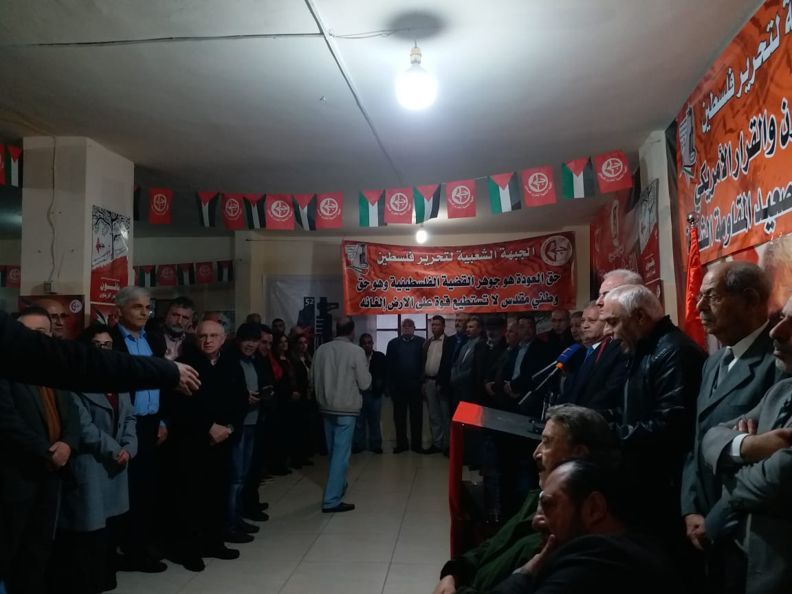في الذكرى الثانية والخمسين لانطلاقة الجبهة الشعبية لتحرير فلسطين، استقبلت الجبهة في لبنان، خلال حفلها السنوي المركزي في بيروت، بمخيم مارالياس، في قاعة الشهيد أبو علي مصطفى، يوم الأربعاء 18/12/2019 وفودًا سياسية، وأعلامية، وممثلين عن الفصائل والأحزاب الوطنية، والإسلامية، فلسطينية ولبنانية: المناضل كمال شاتيلا على رأس وفد من المؤتمر الشعبي اللبناني، المناضل معن بشور، العميد مصطفى حمدان على رأس وفد من حركة الناصريين (المرابطون)، العميد وائل حسنية على رأس وفد من الحزب السوري القومي الاجتماعي ،الحزب الشيوعي اللبناني، حركة الشعب، وفد من الحزب التقدمي الاشتراكي الدكتور بهاء أبو كروم، جبهة النضال الشعبي الفلسطيني، وفد من الأسرى المحررين احمد طالب وعباس قبلان، وفد من رابطة الشغيلة حسن حردان، كاسترو عبد الله، السفير الكوبي في لبنان، القائم بأعمال السفارة الفنزويلية في لبنان عميرة زبيب، جمعية النجدة الاجتماعية،علي محيي الدين، جمال فياض دائرة شؤون اللاجئين الفلسطسنيين، الجبهة العربية الفلسطينية، أنصار الله، وفد من حركة فلسطين حرة، خالد عبادة المجلس الأعلى للشباب والرياضة، جبهة التحرير الفلسطينية، الأستاذ رمزي منصور قنصل سفارة فلسطين في لبنان، وفد من لجنة المتابعة للجان الشعبية الفلسطينية في لبنان، مدير مخيم مار الياس ناصر صالح، وفد من حركة التحرير الفلسطينية فتح، الاستاذ عصام طناني، وفد من الجبهة الشعبية القيادة العامة، مهدي مصطفى الحزب العربي الديمقراطي، الدكتور عبد الملك سكرية، وفد من الجبهة الديمقراطية لتحرير فلسطين، ليليان حمزة الحزب الديمقراطي اللبناني، الشيخ عطالله حمود حزب الله، غسان عبد الغني مدير الضمان الفلسطيني في لبنان، المناضل صلاح صلاح، المناضل ابو مجاهد، وفد من المهندسين الفلسطينيين، وفد من موظفي الاونروا، وفد من حركة الجهاد الإسلامي في فلسطين، وفد من حركة المقاومة الإسلامية حماس، وفد من وجهاء وفاعليات مخيم البرج، وفد من فاعليات ووجهاء شاتيلا، وفد من فاعليات ووجهاء مار الياس، الأستاذ يحيى المعلم، وفد من حركة فدا، الدكتور أحمد علوان رئيس حزب الوفاء، العقيد بلال السرواني مسؤول القوة الأمنية في البرج، وفد من حركة الانتفاضة الفلسطينية، وفد من الأمن الوطني الفلسطيني، وفد من جبهة التحرير الفلسطينية، وفد من اللجنة الشعبية الفلسطينية في مار الياس، وفد من اللجنة الشعبية في شاتيلا، وفد من اللجنة الشعبية في برج البراجنة، وفد من اتحاد عمال فلسطين، وفد من جبهة النضال الشعبي الفلسطيني، وفد من حركة التحرير الوطني الفلسطيني فتح الانتفاضة، الدكتور ناصر حيدر، وفد من جبهة التحرير الفلسطينية، وفد من حزب الشعب الفلسطيني