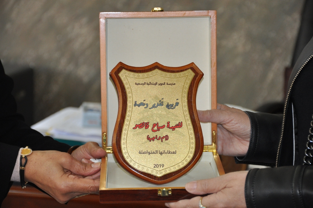 بعد ذلك زار وفد " النهضة النسائية" مدرسة الدوير الابتدائية الرسمية وقدموا التهاني بالاعياد لمديرتها عايدة قانصو وافراد الهيئة التعليمية، وقدموا ألعابا وقصصا لطلاب صفوف الروضة، كما قدمت لهم المديرة قانصو درعا تقديريا، كما قدمت درعا تقديريا للاعلامي سامر وهبي، وكانت كلمة لرئيس التجمع في الجنوب صباح قانصو اثنت فيها على النجاحات التي حققتها مدرسة الدوير الابتدائية الرسمية بفضل الجهود التي تبذلها مديرتها عايدة والهيئة التعليمية