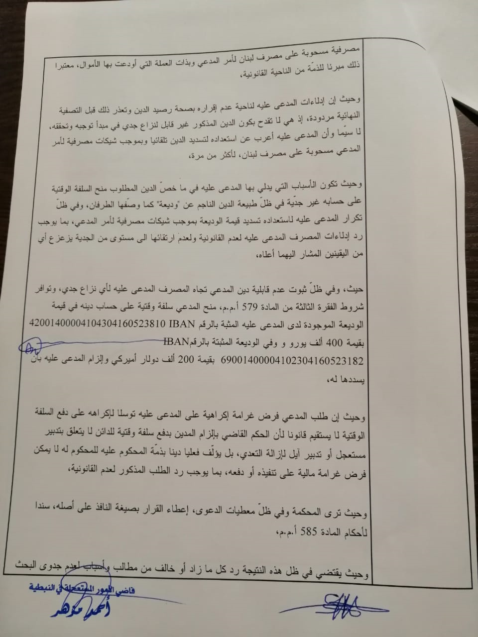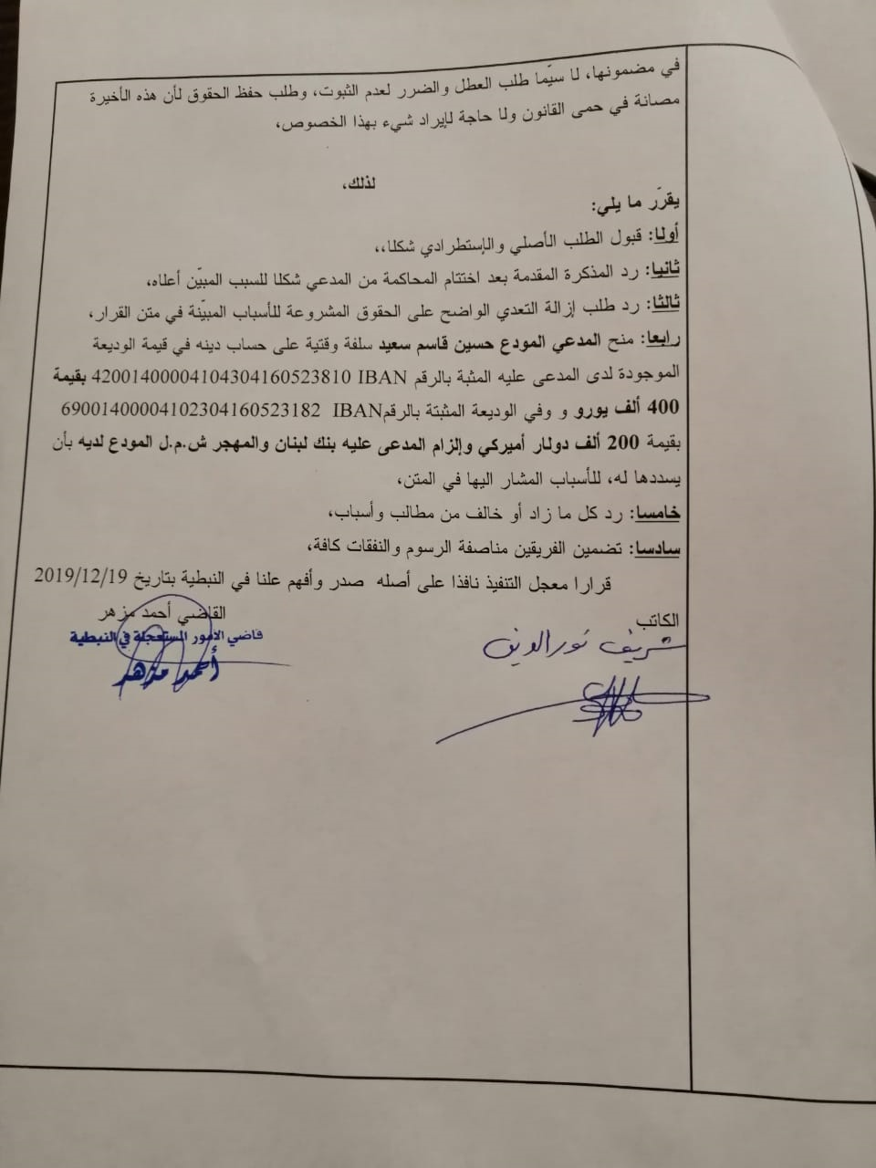 أنه سندا الى إستدعاء مقدم من المودع حسين سعيد بواسطة وكيله المحامي مازن صفية، والذي عرض فيه أنه من تجار السيارات في لبنان ويتعامل مع بنك لبنان والمهجر- فرع النبطية لغايات تجارته، ولديه حساب دائن لدى البنك،وأنه راجع مصرفه للحصول على 400 ألف يورو لحساب تجارته ولتسديد أكلاف تلك التجارة،الا أن المصرف رفض متذرعا بالأوضاع التي لا تسمح بإعطاء المبالغ النقدية.
