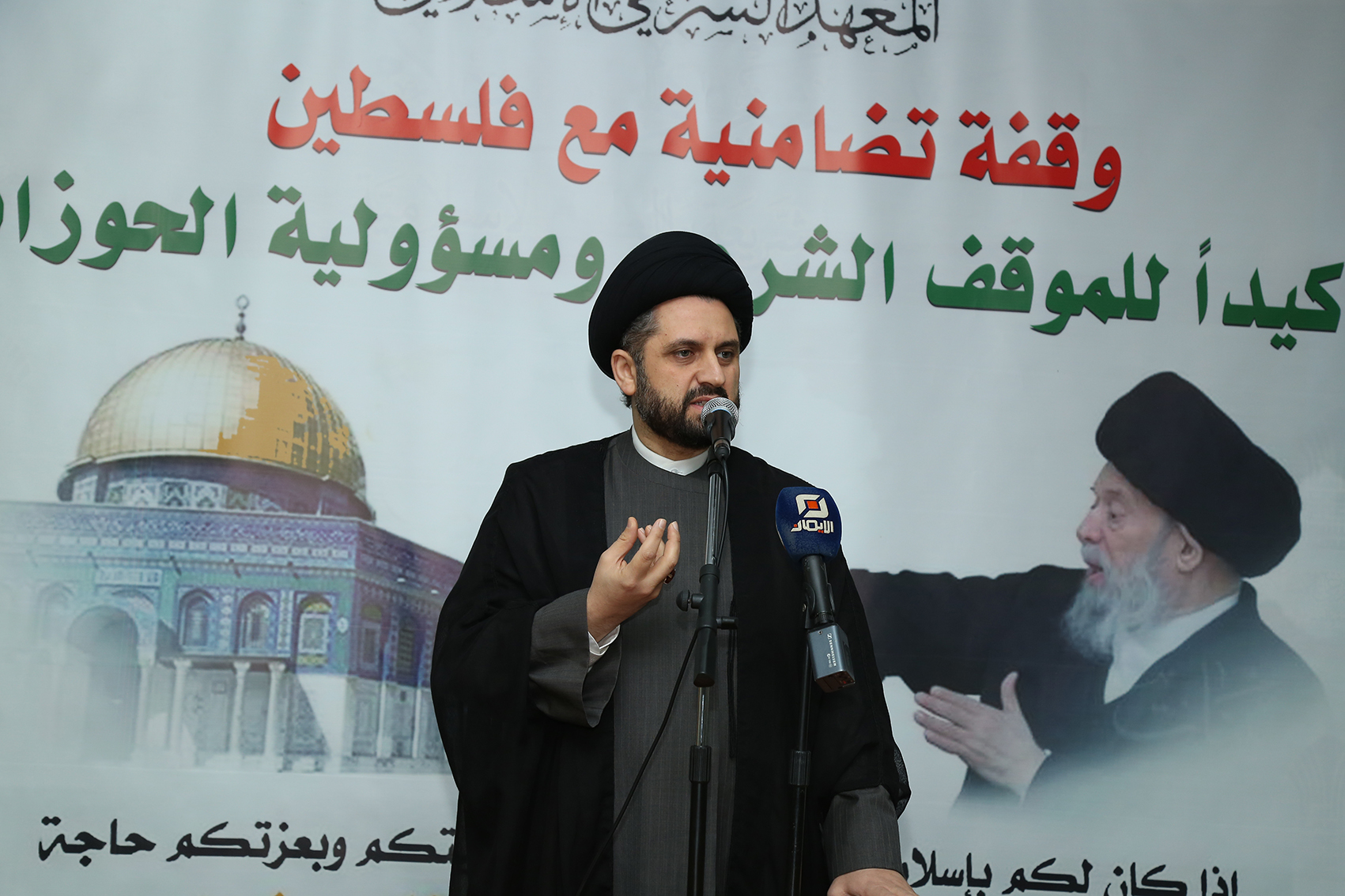 وتخلل الوقفة كلمات شارك فيها أساتذة المعهد ومجموعة من طلابه أكدّت ضرورة الوقوف في وجه هذه الصفقة بمختلف الوسائل، معتبرة أن فلسطين هي مسؤولية الأمة جمعاء والتي ينبغي أن لا تغيب عن وجدانها وعقلها وأن تكون على سلّم أولوياتها، وأشارت الكلمات إلى أن الحوزات العلمية حمل علماؤها مناصرة هذه القضية منذ بداية الاحتلال الصهيوني لفلسطين، فأفتى علماؤها بالدفاع عنها ودعمها بكل الوسائل وتقديم العون والمساعدة إلى أهلها واجازوا صرف الحقوق الشرعية.