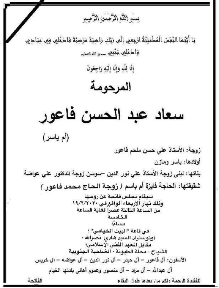 عائلة المرحومة سعاد عبد الحسن فاعور (أم ياسر)
