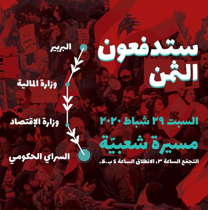 تحت عنوان «ستدفعون الثمن» دعا ناشطون يوم أمس إلى مسيرة تجول شوارع بيروت بعد ظهر يوم السبت القادم 29 شباط 2020.